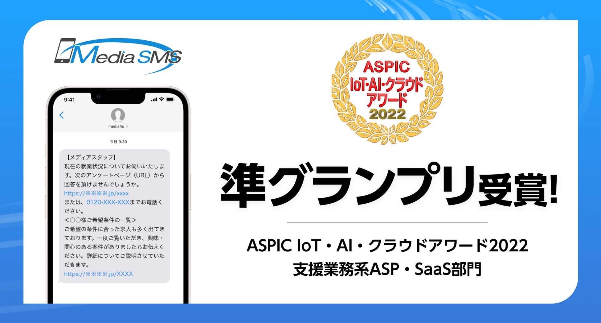 総務省後援「ASPIC IoT・AI・クラウドアワード2022」にてSMS送信サービス「メディアSMS」が支援業務系ASP・SaaS部門 準グランプリを受賞