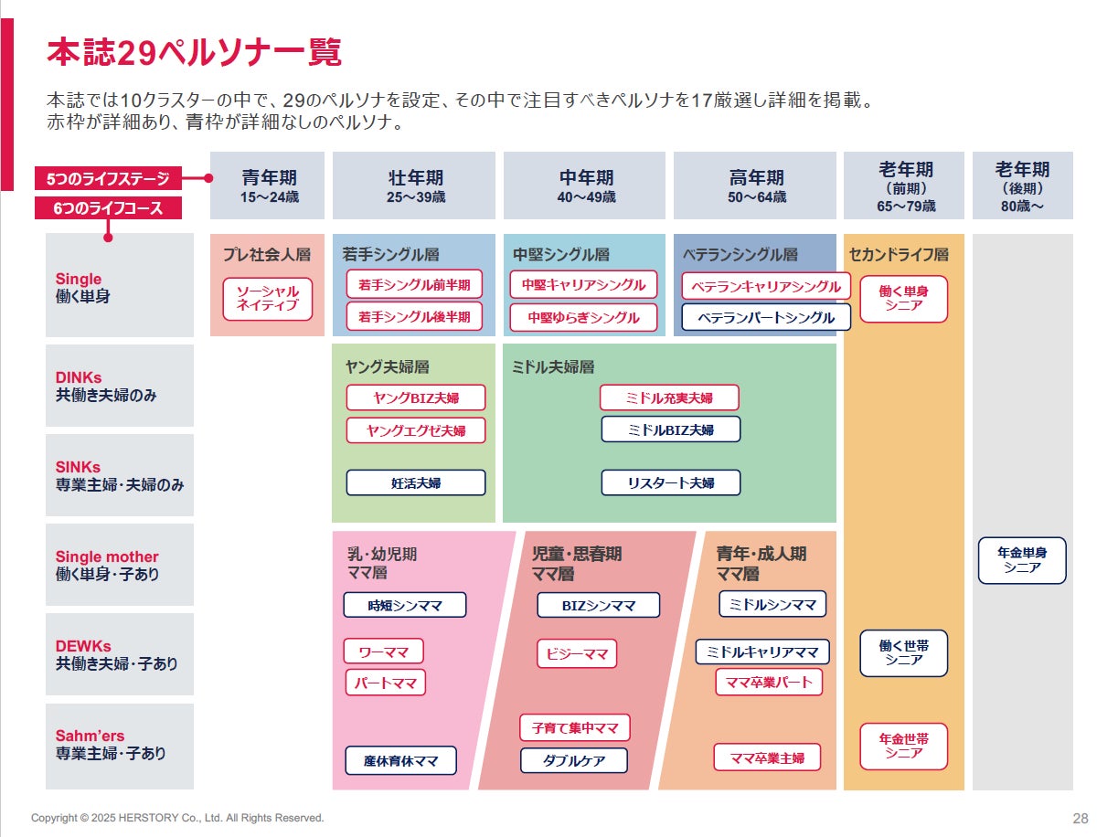 女性インサイト総研を有する株式会社ハー・ストーリィ(本社:東京都港区、代表取締役:日野佳恵子)は、2025年3月10日に「女性ペルソナ年鑑 HERFACE2025」を発売しました。本誌は、対象サンプル約2万人の最新調査データを反映し、クラスターとペルソナの精度を飛躍的に向上させたデータツールです。