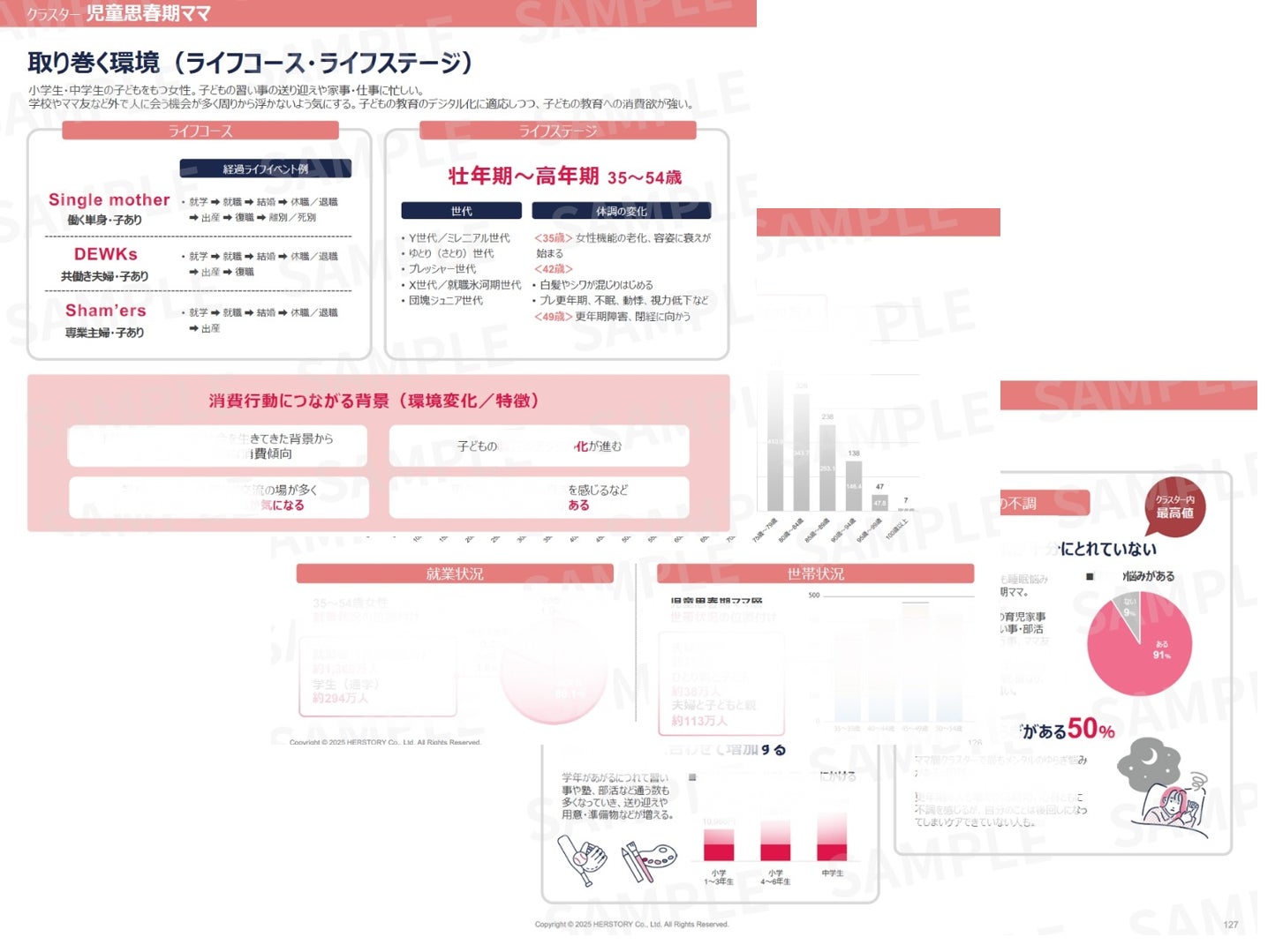 ライフコース(職業・家庭環境など)とライフステージ(年齢・ライフイベント)の組み合わせを基に、10のクラスターを構築。最新の市場データをもとに定量的に検証され、以下のポイントを明確にしています。