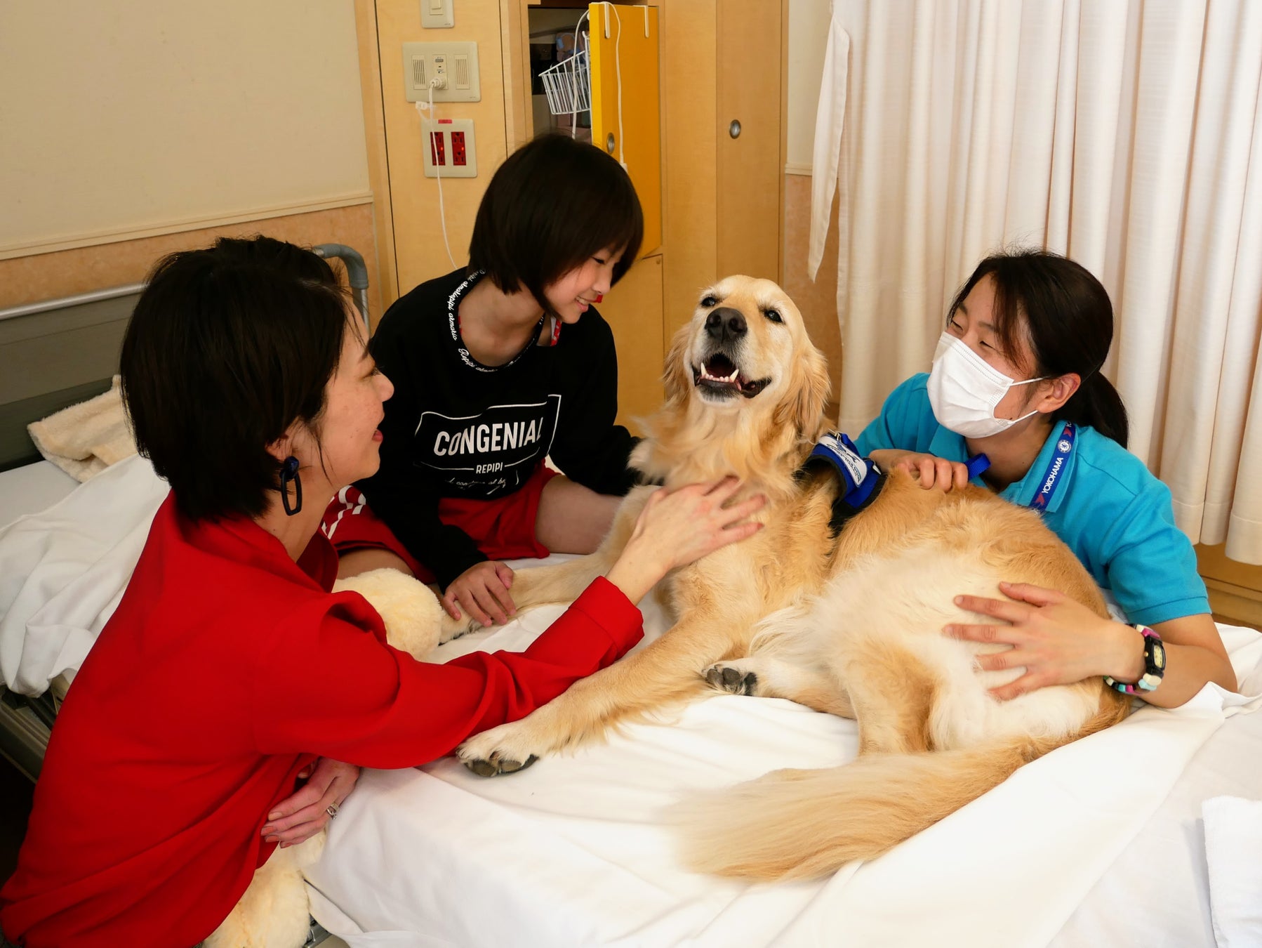 日本では神奈川県立こども医療センターの他、静岡県立こども病院、東京都立小児総合医療センター、国立成育医療研究センターの4病院で展開しています。大きな特徴は、毎日同じ病院に勤務し、個々のニーズに合わせた活動を行うことです。痛い検査や手術室への付き添い、リハビリ支援なども行います。いろいろな病院や施設を巡回訪問することはありません。ときどき訪れて短い時間だけふれ合うのではなく、同じ犬がいつもそこにいて多くの時間を繰り返し過ごせることが、入院治療している子どもたちの心の励みになります。