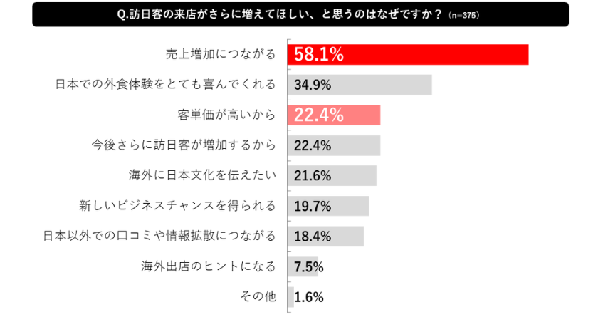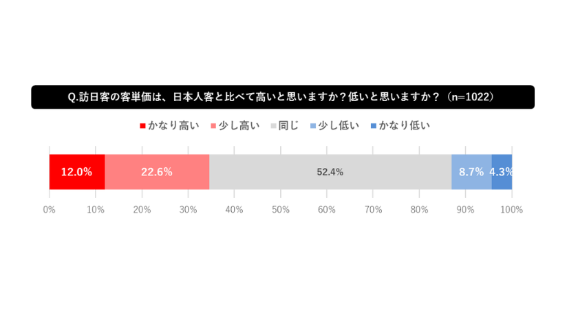 訪日客の来店が「増えてほしくない」理由を尋ねたところ、トップに挙げられたのが「外国語対応が難しい」だった。次いで、「マナーが悪い」「メニュー対応が難しい」と続き、いずれも言語が絡むコミュニケーション関連の理由が上位を占めた。一方、訪日客が「もっと来てほしい」と回答した層に、その理由を尋ねたところ、「売上につながるから」という理由が最多で、3位には「客単価が高い」という理由もランクインした。訪日客と日本人客の客単価比較では、訪日客の方が単価が「高い」と回答したのは34.6%で、「低い」と回答した13.0%を大幅に上回った。すでに訪日客の来店が、飲食店の利益をさらに拡大する重要な一要素となっていることが分かる。