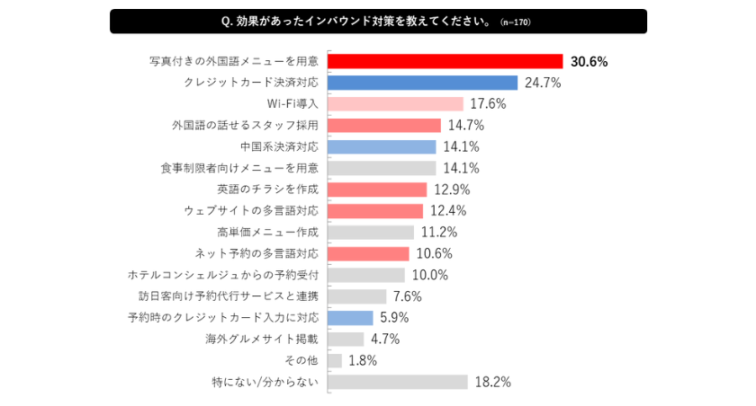 さらに、インバウンド対策を実施している飲食店に効果があった対策方法を尋ねた。最も効果があったのは、「外国語メニューを用意」することだった。課題のトップだった「外国語での接客」に呼応した結果だといえる。2位にはキャッシュレス決済対応が入った。訪日客からのニーズは特に高いことがうかがえる。「Wi-Fi導入」が3位に入っているのは、ゲストのスマートフォンの通信環境をよくすることで、言語にも会計にもスムーズに対応できるようになることから上位にランクインしたと考えられる。