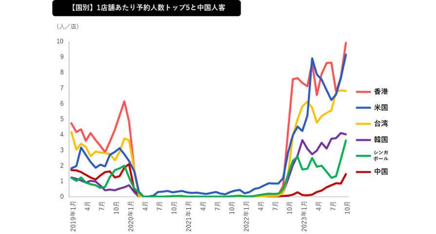 次に国別の訪日客予約人数を見てみると、日本での外食に対してニーズが特に強い国が浮き彫りになってくる。コロナ前から変わらず、香港、台湾、米国がトップ3を占めており、日本で外食することに特に関心が高い国といえる。コロナ前後で大きく変化したのは、韓国だ。2023年10月の韓国人の予約人数は、2019年同月比で約9.5倍にまで急増している。訪日客全体においても、韓国からの訪日客数が最多となっており、韓国人客の飲食店予約が急増している理由は明白だ。2023年10月時点の予約人数は、韓国人客は4位にとどまっており、さらに飲食店へ誘致できる余地があると考えられる。