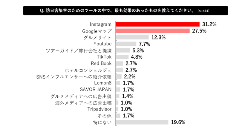 最後に、訪日客の集客で最も効果のあったツールを尋ねた。1位「Instagram」2位「Googleマップ」となり、コロナ下で進んだ両社の飲食店検索・予約機能強化が影響した。いずれもほぼ全世界に膨大なユーザーを擁しており、レビューなどの投稿件数、店舗情報などの情報量が他サービスを圧倒している。特に英語圏のユーザーに対する情報発信、予約獲得は有効な2大ツールとして飲食店の間に定着している。