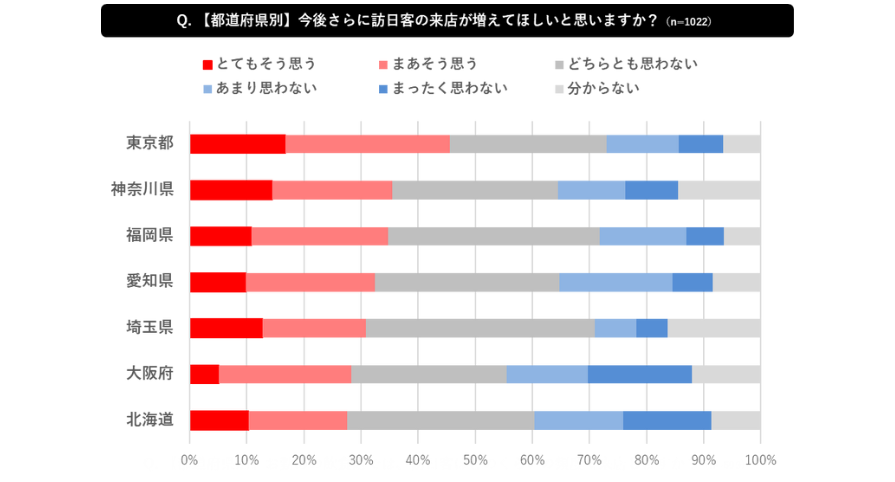 コロナ収束後、日常的に訪日客も飲食店を訪れるようになったが、飲食店側の受け入れ態勢が整っていない現状が見えてきた。「訪日客の来店がさらに増えてほしいか」という設問に対して、「増えてほしい」と回答したのは、36.7%となり、コロナ前の調査からわずか3.1ポイント上昇するにとどまった。一方、「増えてほしくない」と回答した人は、いまだに22.6%存在する。コロナ前調査から9.6ポイント減少したものの、インバウンド外食市場が急激に拡大を続けている状況と、飲食店側の姿勢が乖離しているといえる。主要な都道府県別にみると、訪日客に対して最も消極的なのは、北海道だった。すでに国内客で賑わう観光地であることやオーバーツーリズム問題などが背景にあると考えられる。訪日客の受け入れ姿勢が最も積極的だった東京でさえ、訪日客の来店が「もっと増えてほしい」と回答した層は、過半数を下回る45.5%だった。