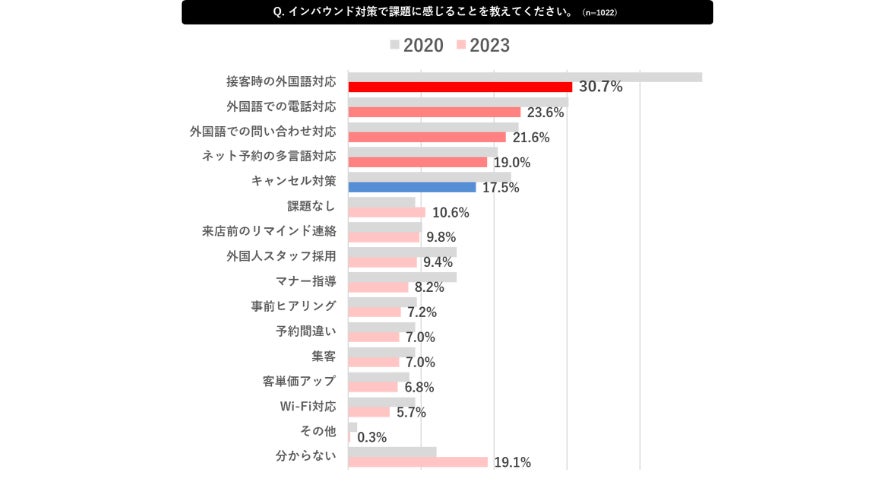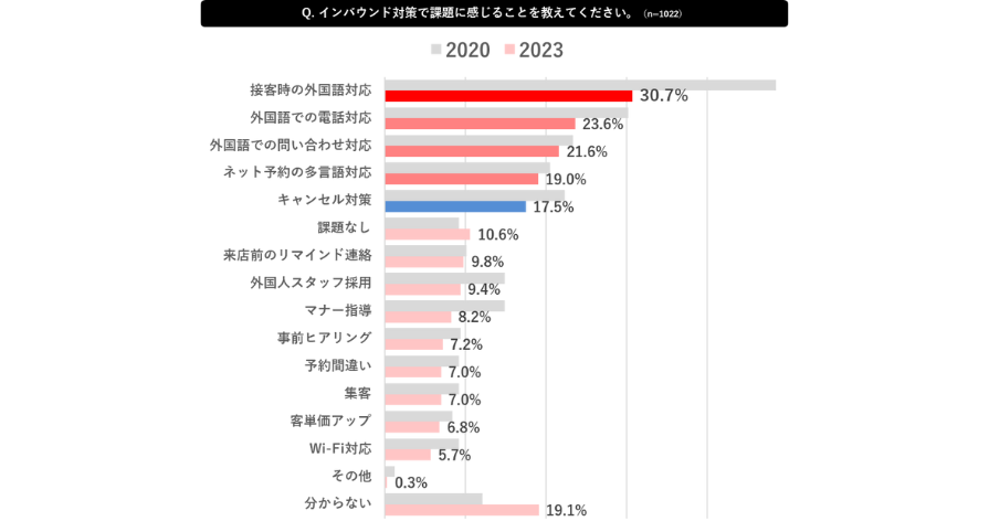 訪日客を迎える上で感じている課題で、最も多かったのは言語対応関連だった。「接客」「電話対応」「問い合わせ対応」「ネット予約の多言語対応」、と上位4つが言語に関する課題だった。5位に入った「キャンセル対策」も、訪日客を迎える上で切実な問題だろう。日本人客に比べて、訪日客のキャンセル率は10ポイント以上高いというデータもあり*⁴、予約時のカード情報入力などのキャンセル対策は必須だろう。全体的にコロナ前の調査から全項目で数値が低下しており、徐々にではあるが課題が解決むかって動いている状況が見える。