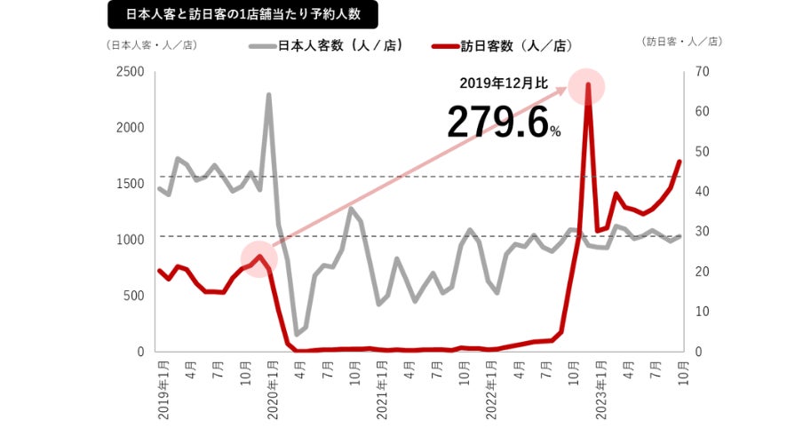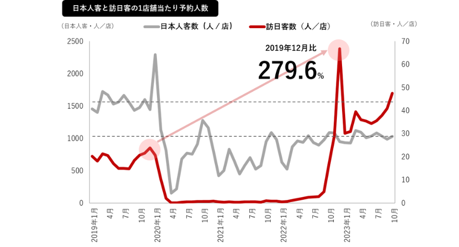 当社の予約システムに蓄積されている全国約7,000店舗の予約データを分析した。まず、日本人客と訪日客の1店舗当たりの予約人数を比較すると、日本人客は直近2023年10月の予約人数が、2019年同月比で69.8%にとどまっているのに対して、訪日客の予約人数は、2019年同月比で229.4%になっている。さらに、客足がピークを迎える12月の予約人数を比較すると、2022年12月は2019年同月比で279.6%と、3倍に届く勢いで増加していることが分かった。日本政府観光局が発表している2023年10月の訪日外客数は初めてコロナ前を超え、2019年同月比100.8%にとどまっていること*¹と比較すると、特に訪日客による外食需要がコロナ前よりも急激に高まっていることを示しているといえるだろう。