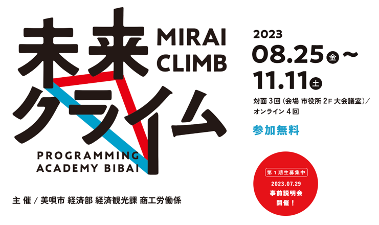 2023年度、未来クライム第一弾として「未来クライム~PROGRAMMING ACADEMY BIBAI~」を開講し、美唄市からIT人材を輩出していくために、継続的にプログラミングを学ぶ場を提供していきます。初年度は、Webサイト開発に必要となる基礎的な言語を学び、カスタマイズ出来る技術の習得を目指します。