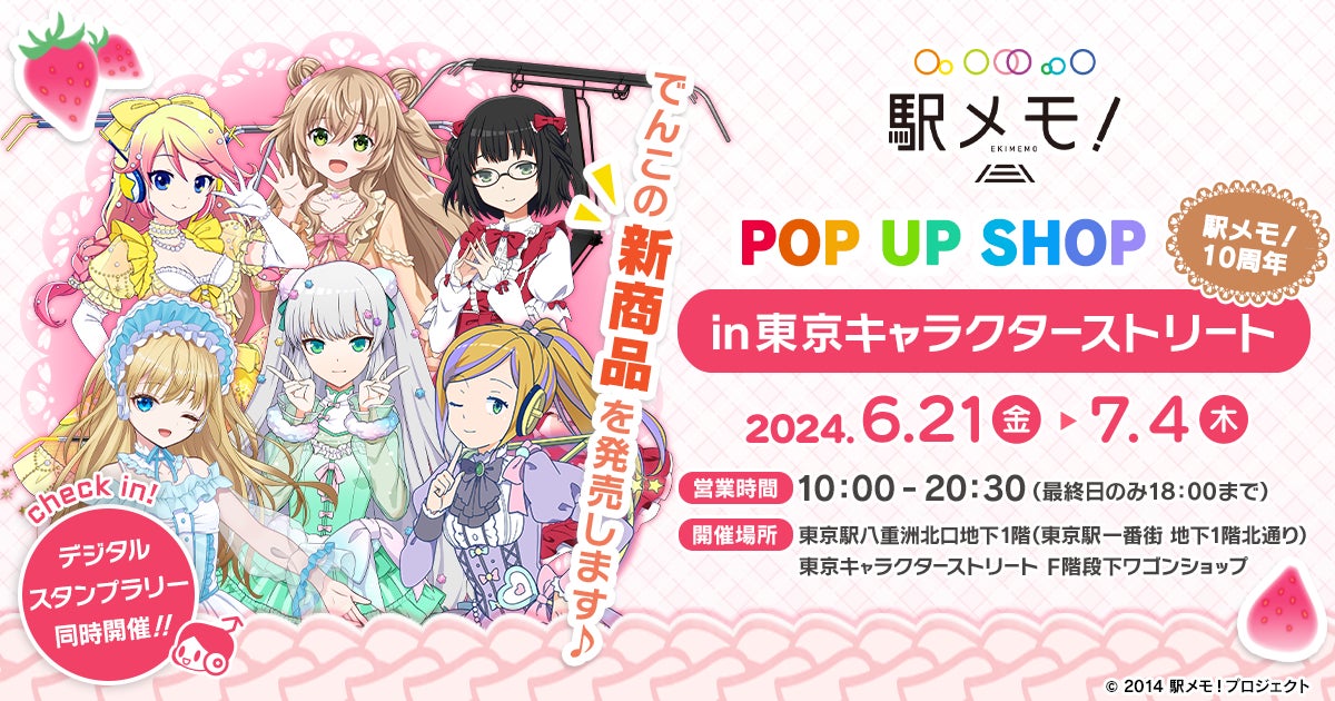 2024年6月21日(金)より、東京駅一番街 東京キャラクターストリートにて、「駅メモ!」10周年を記念したオリジナルグッズを期間限定で販売します。「駅メモ!」オリジナルグッズを2,200円(税込)以上お買い上げのお客様へのノベルティ企画や、ゲーム内にて、デジタルスタンプラリーイベントを実施します。