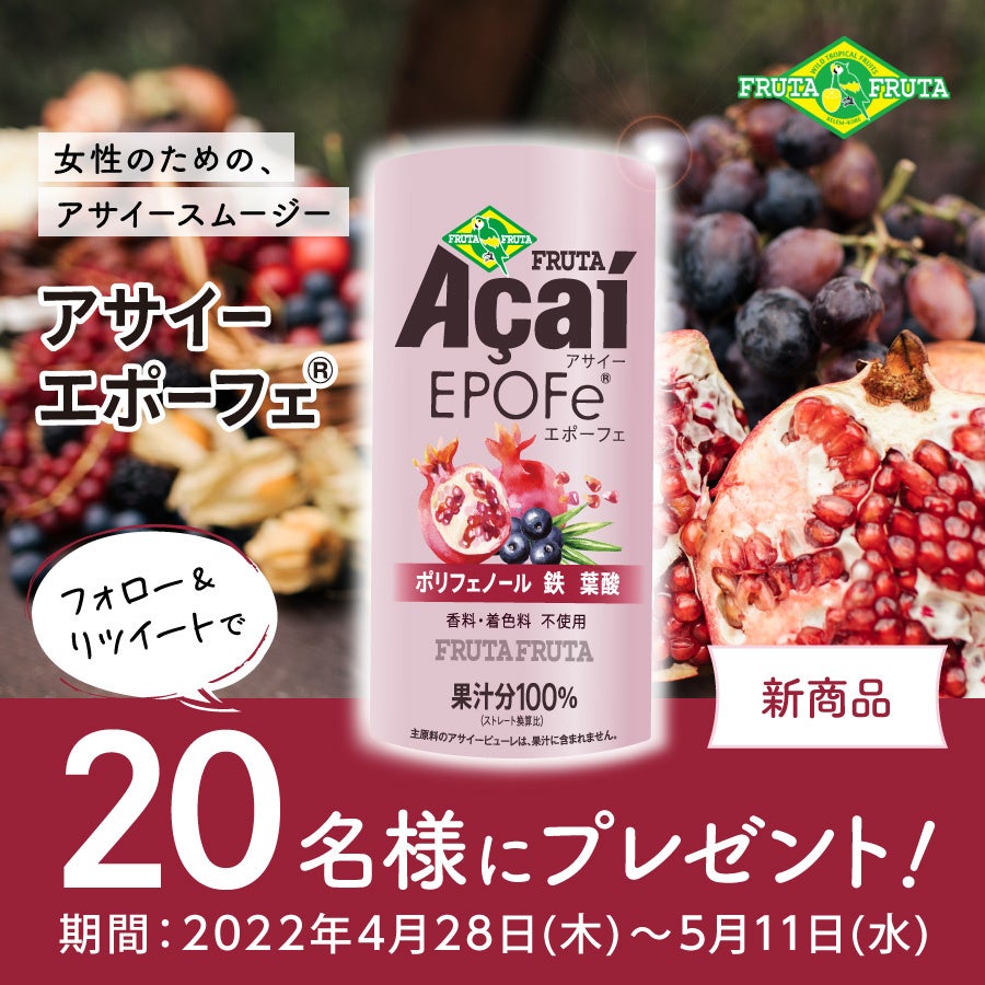 この度、株式会社フルッタフルッタ(所在地:東京都千代田区 社長:長澤 誠、以下当社)では、2022年3月に発売したアサイースムージー『フルッタアサイー アサイーEPOFe®』の発売記念キャンペーンを2022年4月28日(木)~5月11日(水)にTwitterにて行います。当社の公式Twitterアカウント(@frutafruta)をフォローして、対象のツイートをリツイートしていただいた方の中から抽選で20名様に商品をプレゼントいたします。この機会にぜひご参加ください。