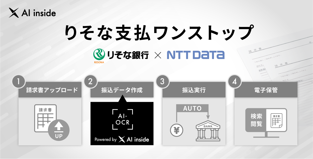 「世界中の人・物にAIを届け、豊かな未来社会に貢献する」をミッションに掲げ、AIプラットフォームを提供するAI inside 株式会社(代表取締役社長CEO兼CPO:渡久地 択、本社:東京都渋谷区、以下「AI inside」)は、りそなグループの株式会社りそな銀行(社長:岩永 省一、以下「りそな銀行」)と株式会社NTTデータ(社長:本間 洋)が共同事業により開発し、本日より取扱開始となる新たな企業間決済サービス「りそな支払ワンストップ(以下「本サービス」)」に、AI inside がAI・インテリジェンスAPI群として提供する「Developer’s API」の一つ、文字認識APIが採用されましたことをお知らせします。AI inside はAIインフラを提供するプラットフォームとして、今後もさまざまな社会基盤や商材との連携を通じて、ハイパーオートメーションによる業務プロセスの改善・ビジネス変革の推進に貢献します。