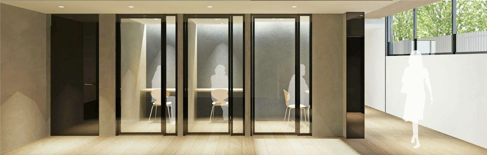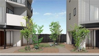 2棟をゆるやかに繋ぐ中庭を配し、敷地南側に広がる竪川河川敷公園から緑と光を取り込む開放的で一体感のある空間としています。また、西棟の1階共用部には入居者専用のリモートワーク等に対応する個別ブースを設けるなど多様化する働き方に応える機能を充実させています。さらに、両棟からスムーズに個別ブースへアクセスできる動線計画とすることで入居者の利便性を高めます。