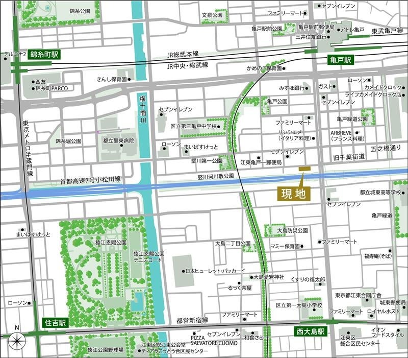 JR総武線「亀戸」駅徒歩6分、都営新宿線「西大島」駅徒歩7分、JR総武線・東京メトロ半蔵門線「錦糸町」駅徒歩15分と3駅3路線が利用可能で、大手町・東京駅方面のビジネス拠点への移動も快適な立地です。また、亀戸・錦糸町エリアは商業・住宅機能がバランス良く集積するだけでなく、猿江恩賜公園(徒歩8分)など豊かな自然にも触れながら落ち着いた暮らしも実現できる立地です。
