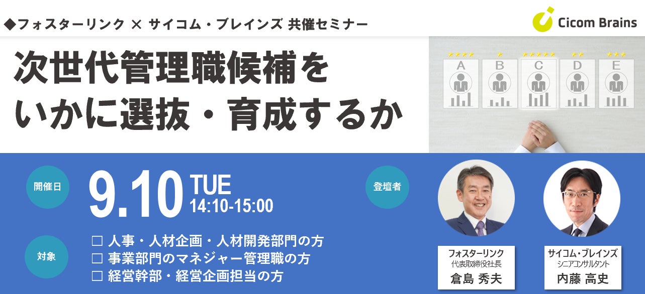 【次世代管理職候補をいかに選抜・育成するか】フォスターリンク×サイコム・ブレインズ共催セミナーを9月10日(火)開催決定!