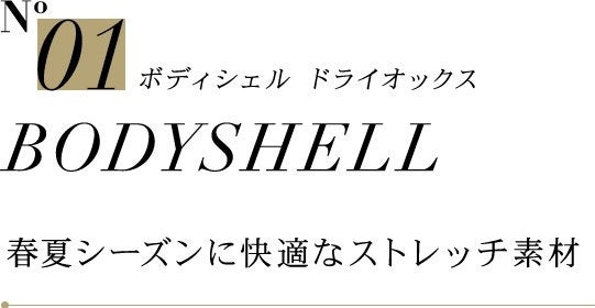 ポリエステル機能糸「ボディシェルドライ」を使用した機能性ストレッチ素材。光の透過を抑える糸なので透けにくく、さらに吸水速乾性、UVカット機能のついた春夏シーズンに快適な素材です。キックバック性に優れたストレッチ性で着心地も抜群。麻をブレンドし、さらに表面に表情を出す加工を施すことでナチュラルなシャンブレー感を楽しめる、ジャケットとパンツ2型での展開です。