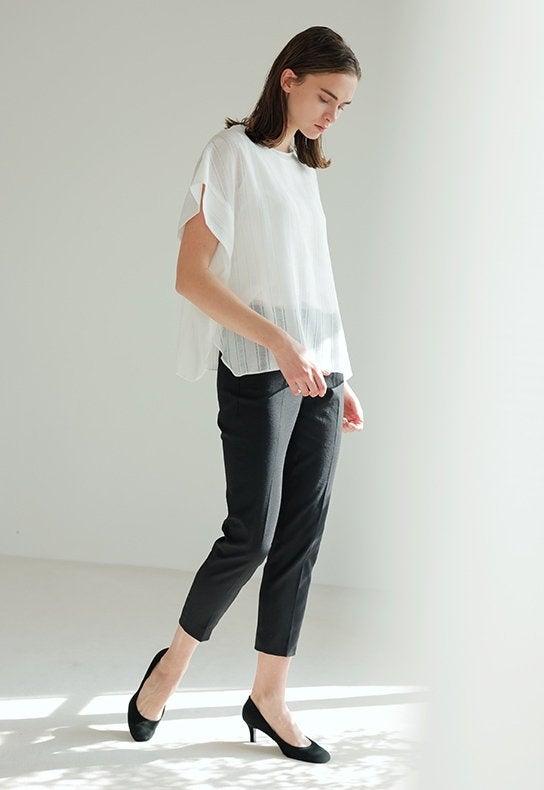 ラ エフの定番、美脚シルエットのパンツ。生地の余分が出ないようウエストのゴムはあえて無くし、ジャストサイズで穿くことでより美しく見えます。5サイズで展開。ヒップを立体的に見せるワイドストレートパンツの展開もあります。