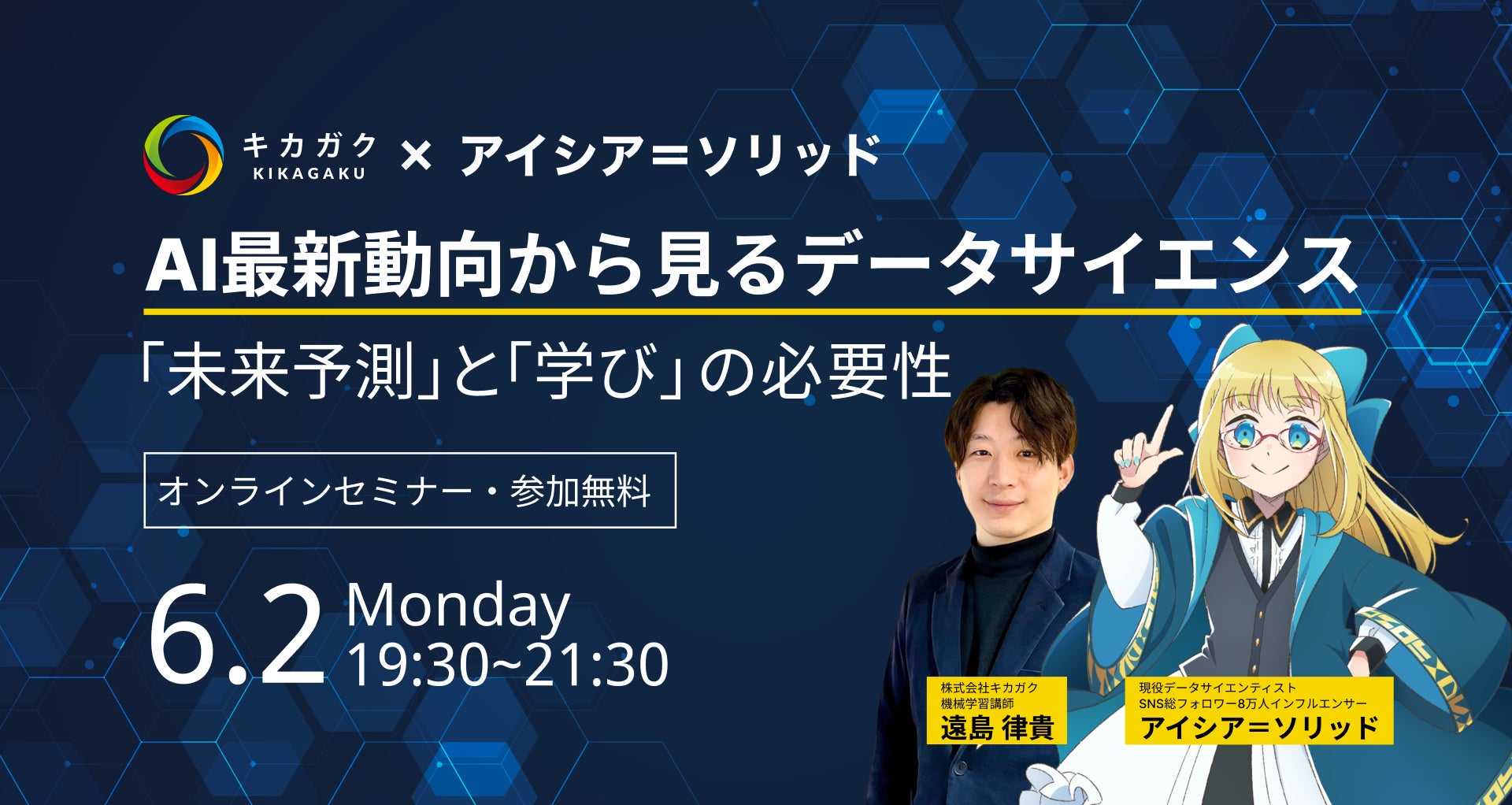 人工知能・機械学習を含めた先端技術に関する教育事業を展開する株式会社キカガク(本社:東京都渋谷区、代表取締役社長:大崎 将寛)は、YouTube 登録者数 6 万人超のバーチャルデータサイエンティストである、アイシア=ソリッド氏をゲストに迎え、コラボウェビナーを開催します。