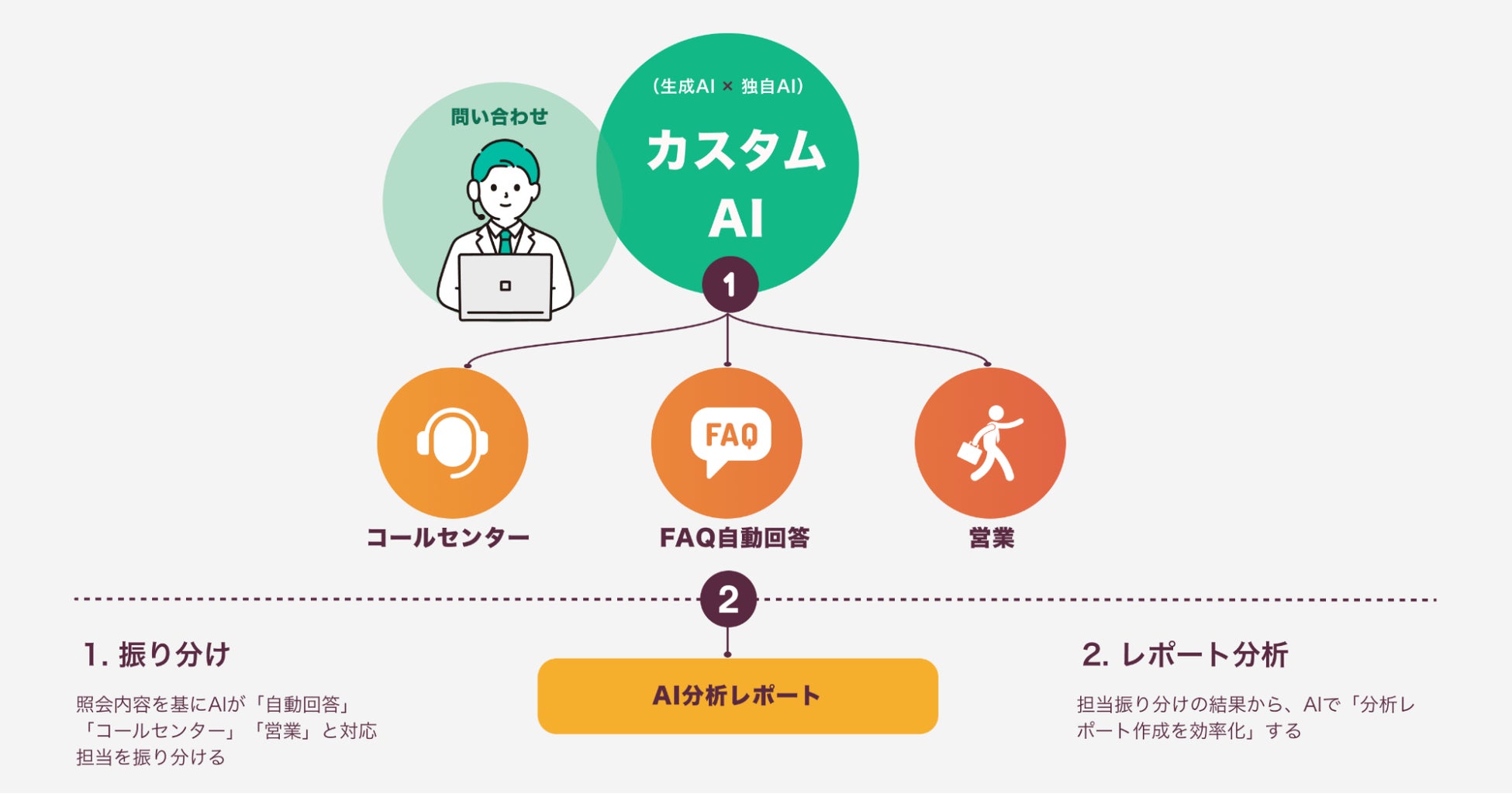 生成AIと独自AIを活用して、来着した照会を回答難易度等に応じて「コンタクトセンター対応」「営業拠点対応」「FAQによる解決」に自動的に振り分けることで、最適な担当体制を実現し、業務時間の大幅削減と顧客対応の迅速化を目指します。