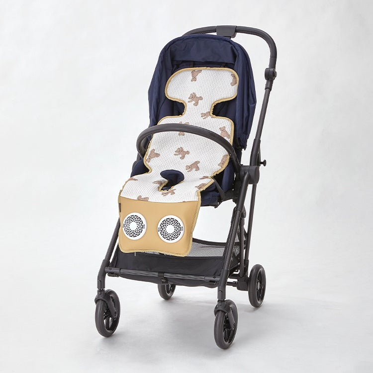 そんな赤ちゃんを、暑さから守るために「ベビーカー用クールファンシート ヒーミークール」を開発。ベビーカーやチャイルドシートに簡単に取り付けることができるファン付きシートで、ファンから取り込んだ新鮮な空気をシート全体に送ることで、蒸し暑くなりがちなベビーカー内や、蒸れやすい赤ちゃんの背中を快適に保ちます。