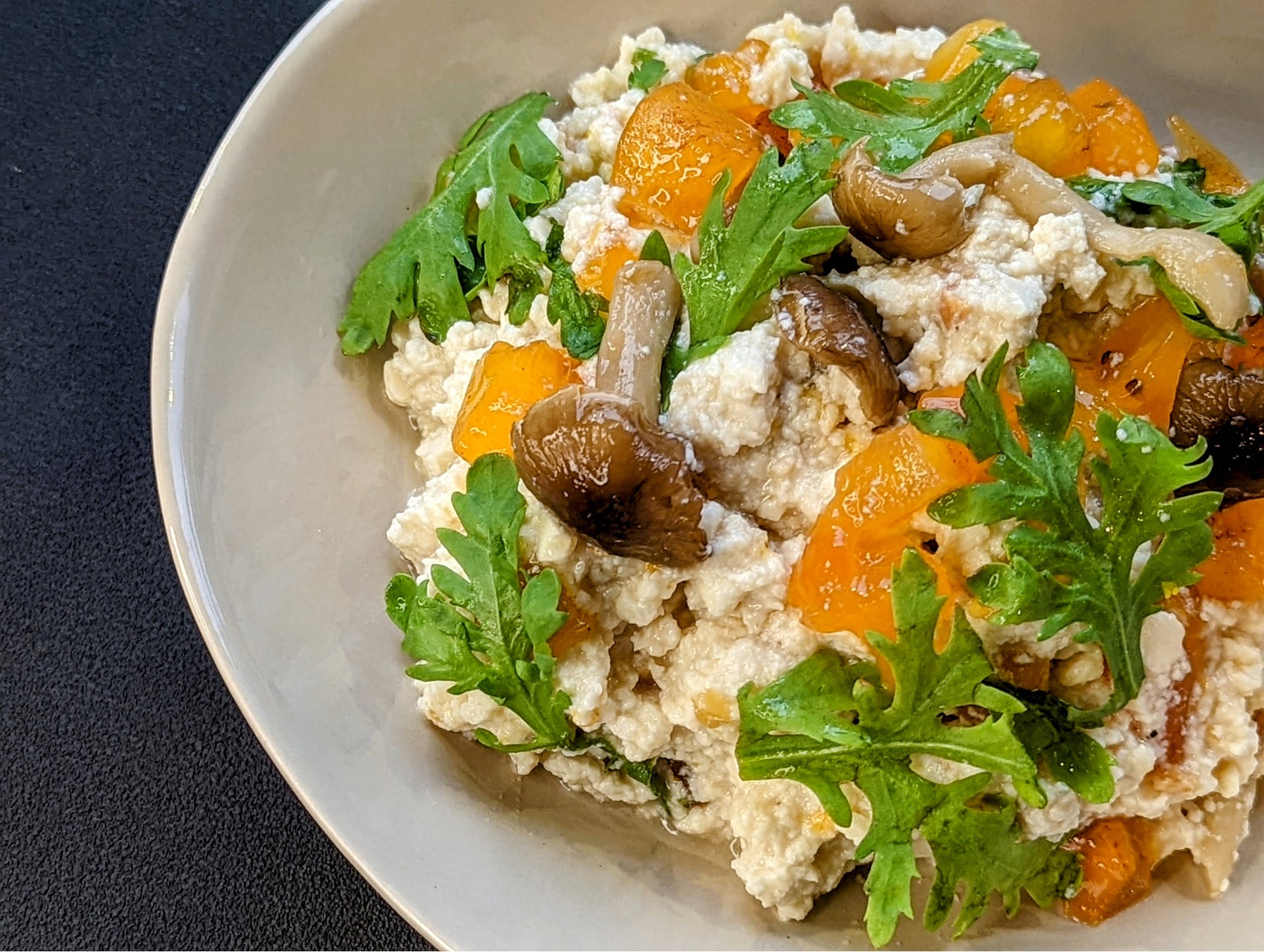 柿のフルーティーな甘さ、旨みが豊富なしめじ、春菊の独特な苦みなど、素材それぞれの味を、ピーナッツバターでコクを加えた白和えでやさしく包み込みました。