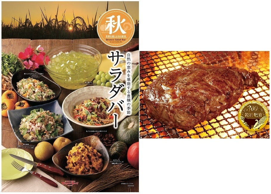 ステーキハウス ブロンコビリーを全131店舗展開する株式会社ブロンコビリー(本社:愛知県名古屋市 代表取締役社長:竹市 克弘)は、9月8日(木)より季節限定『秋サラダバー』の提供を開始します。また、霜降りでやわらかく濃厚な味わいの『炭焼きファイブスターリブロースステーキ』も、新たに期間限定でお楽しみいただけます。食欲の秋に、是非ご一緒にお楽しみください。