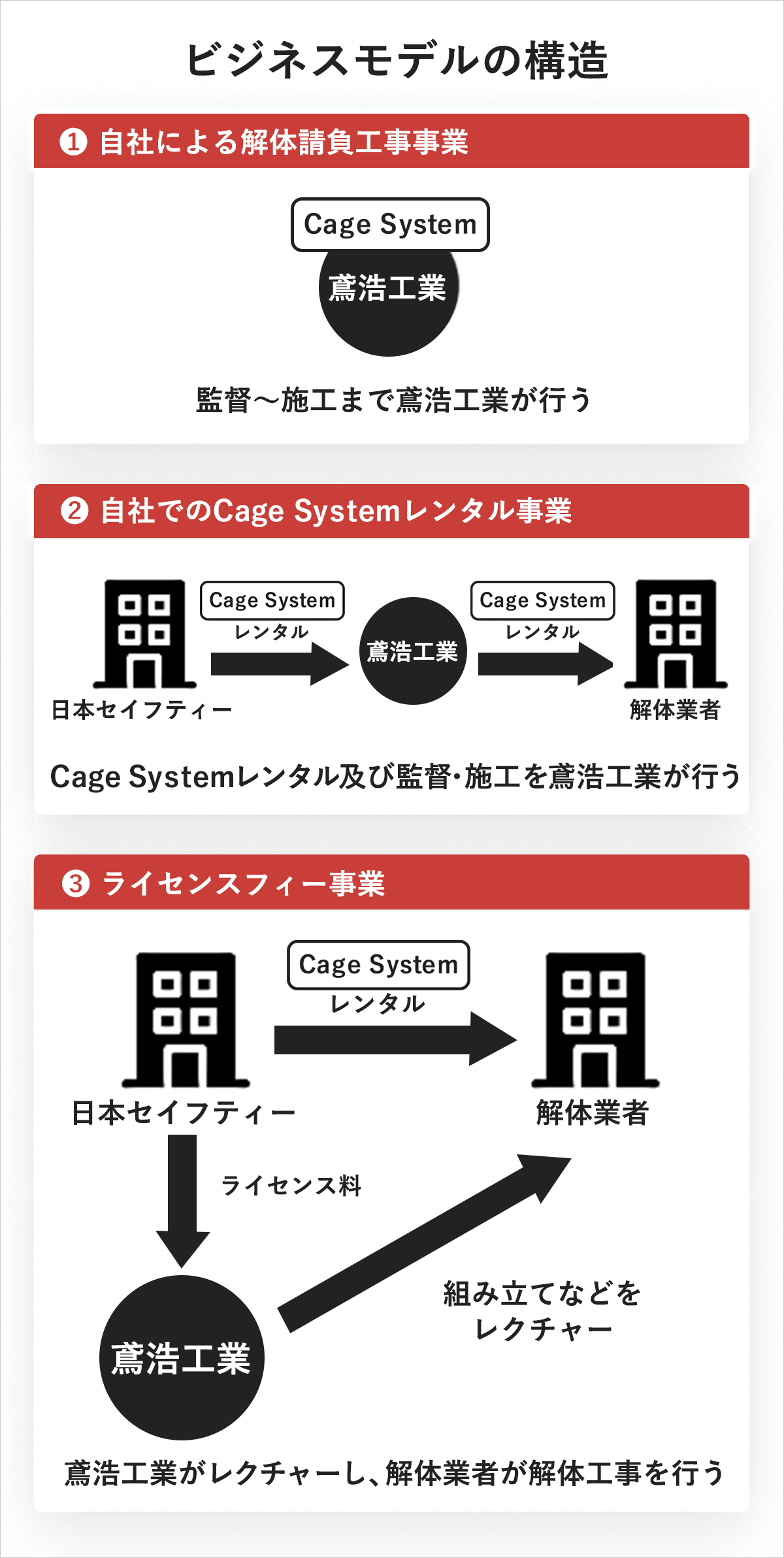 CageSystemスタンダード工法化を目指し、今後は自社の解体工事の受注を縮小させ、CageSystemの普及に経営資源を投入し、Cage Systemのレンタル事業、CageSystemのライセンス事業を収益の柱にしていく所存です。