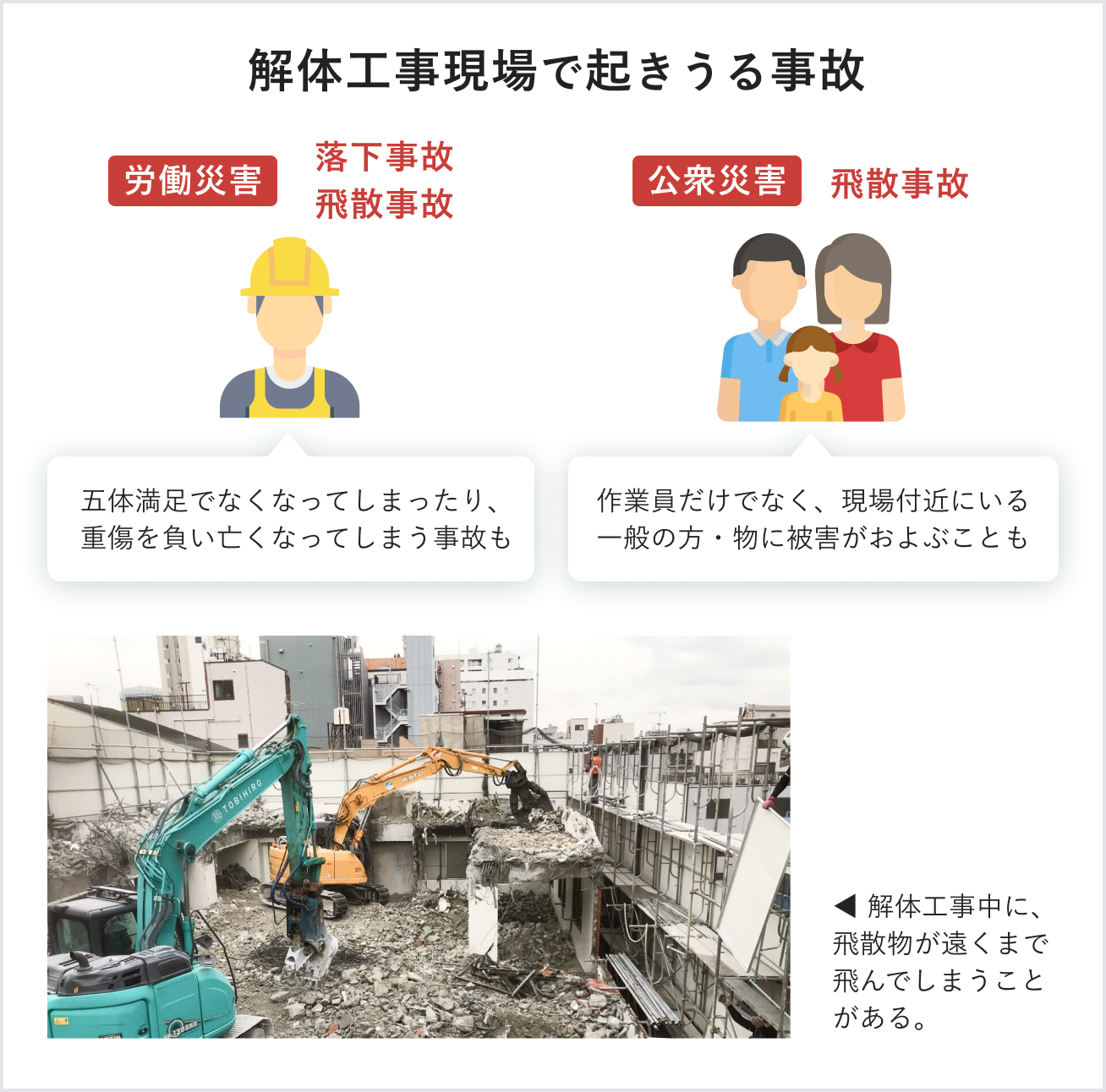 高層の建物の解体工事を行う場合、小さな破片や部品でも飛散したものが人に当たれば致命傷になってしまいます。解体業界では、飛散による凄惨な事故現場に立ち会うことは少なくありません。事故によって重傷を負い亡くなってしまった方や、五体満足ではなくなってしまった方もいます。