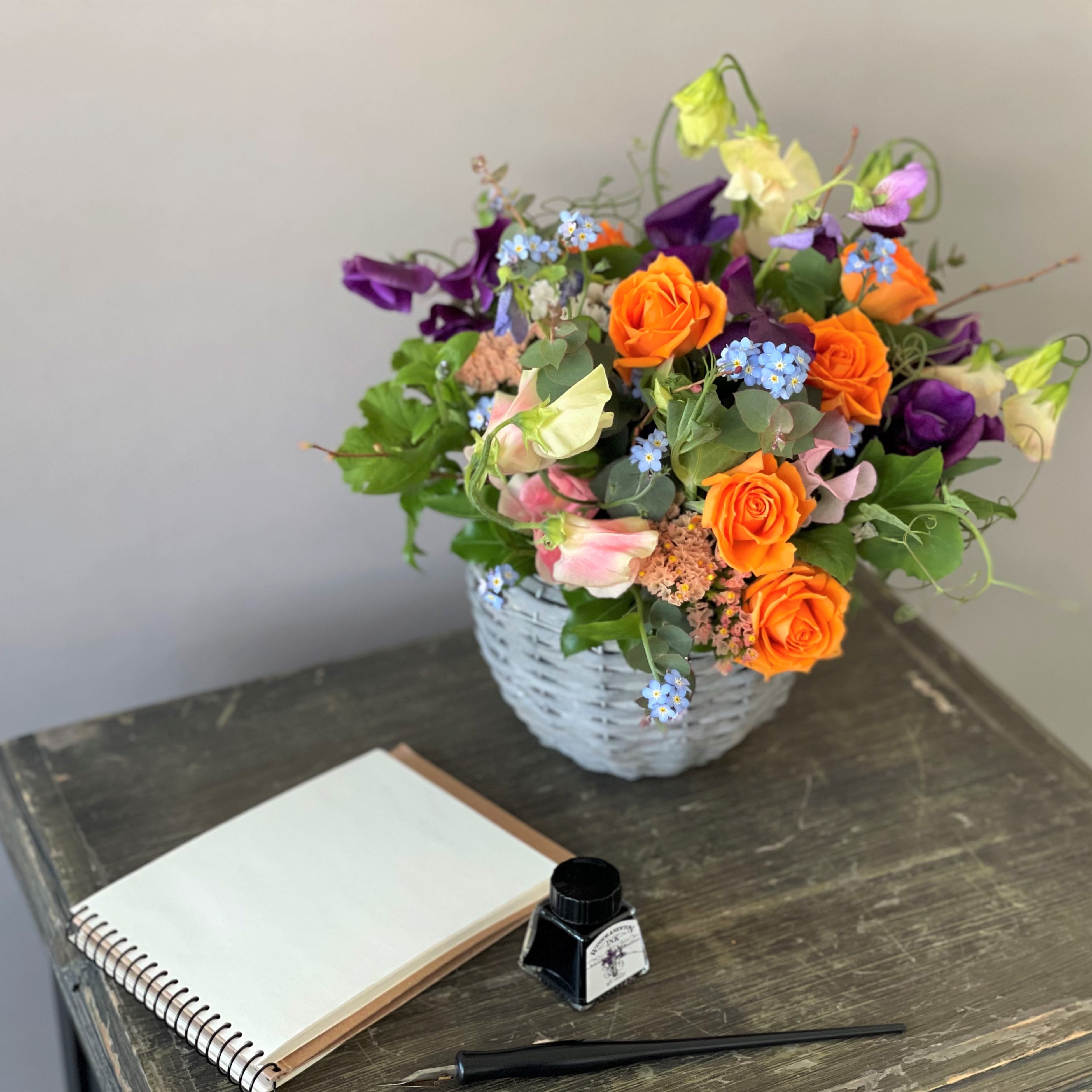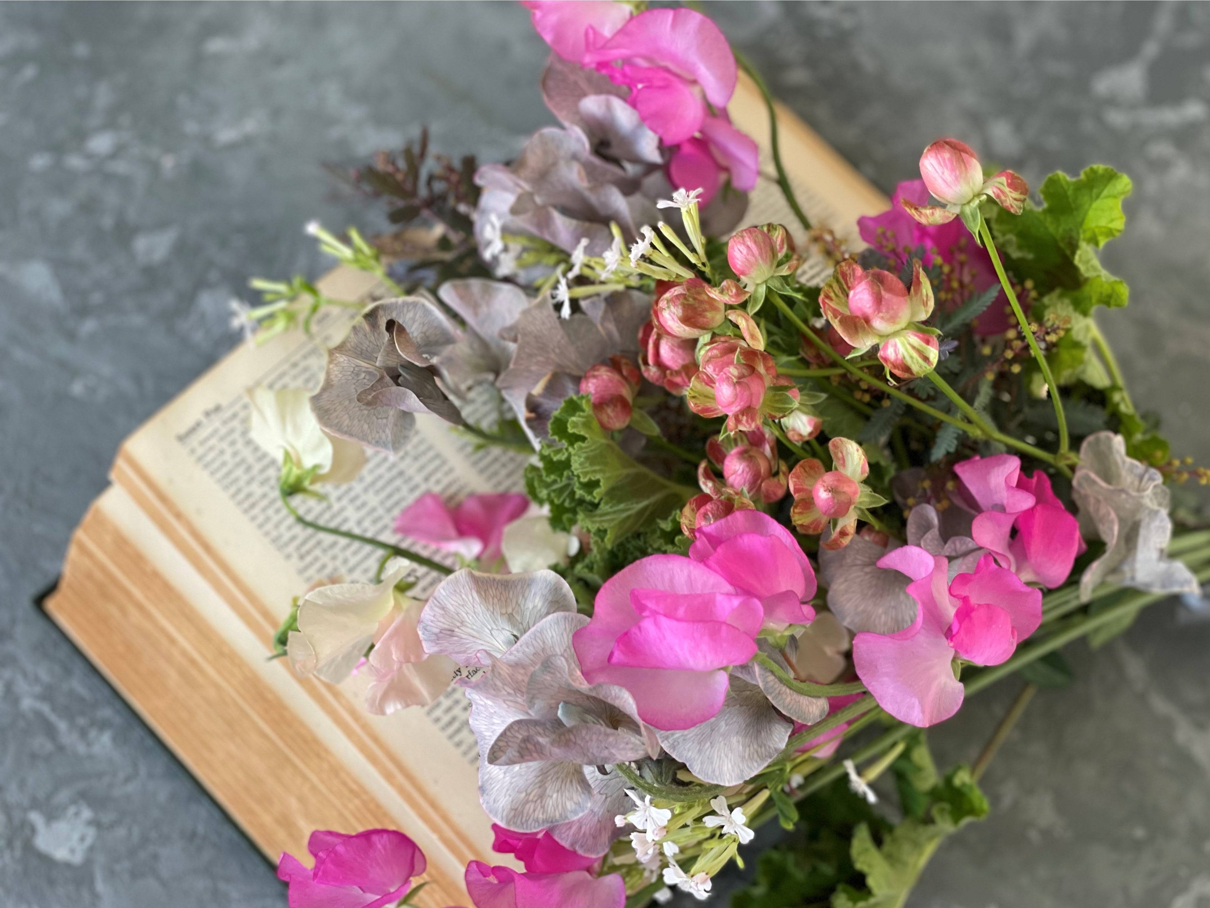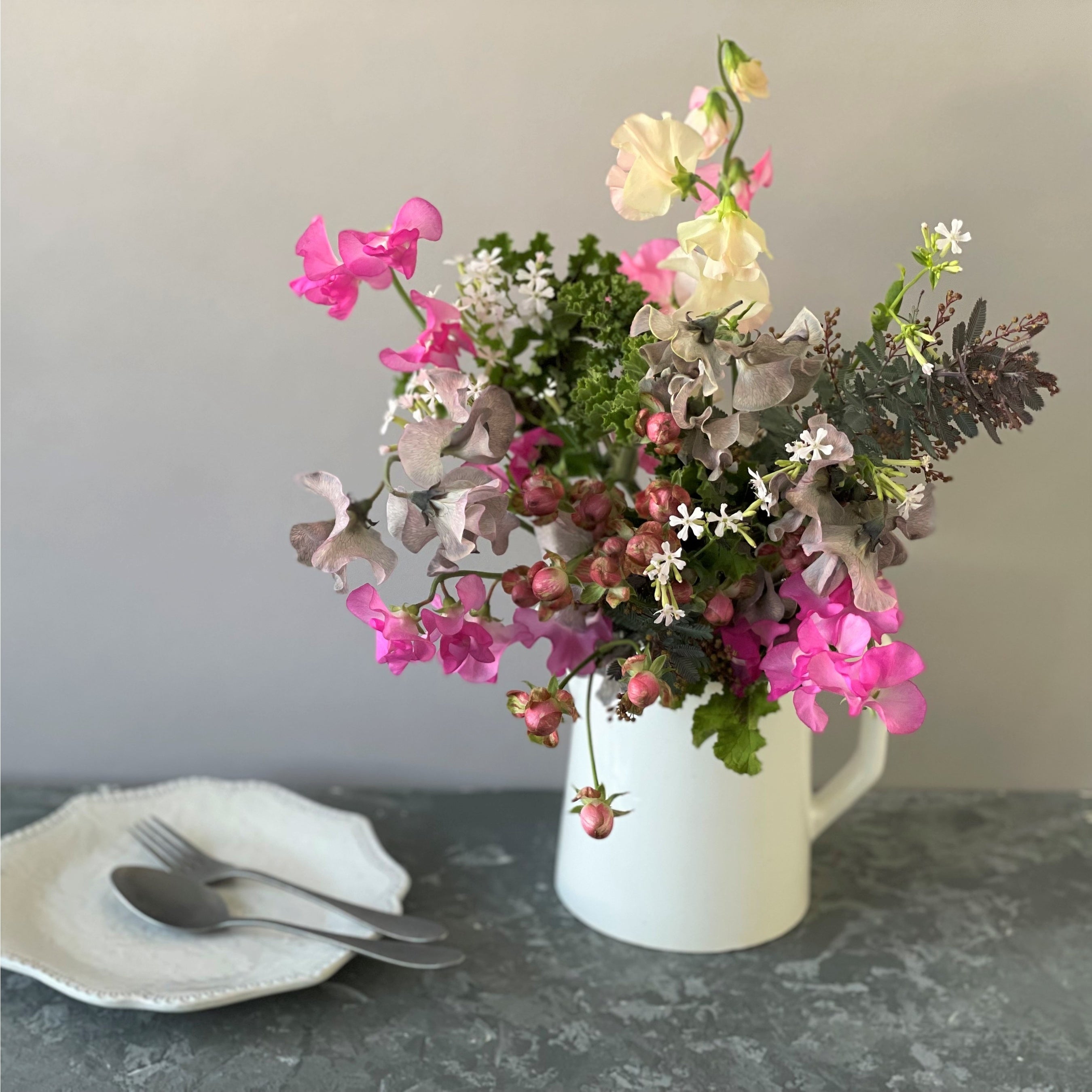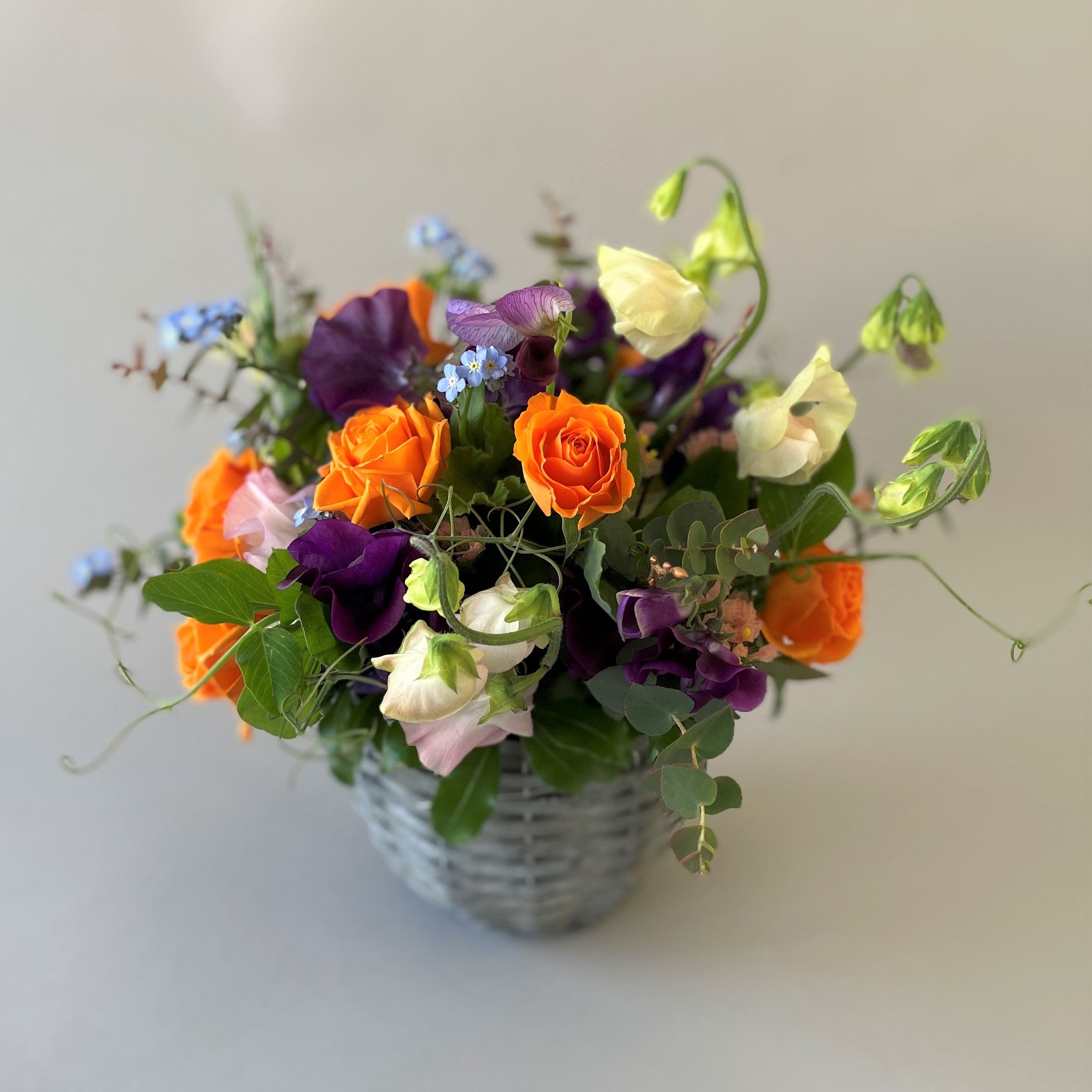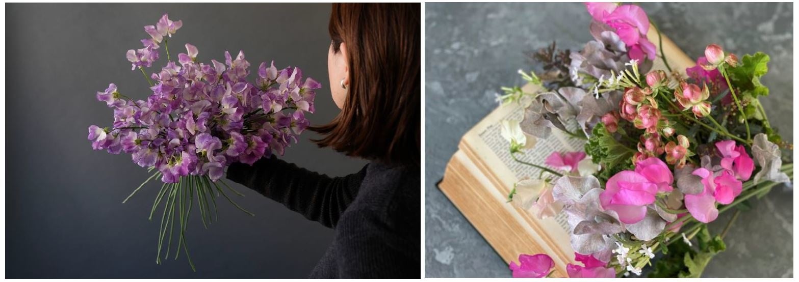 グレイッシュな色合いにガーリーなピンクを合わせたり、紫とオレンジのような反対色でコントラストを楽しんだりと、スイートピーの鮮やかな色合いと香りで、心と体をリフレッシュしてみてはいかがでしょうか。