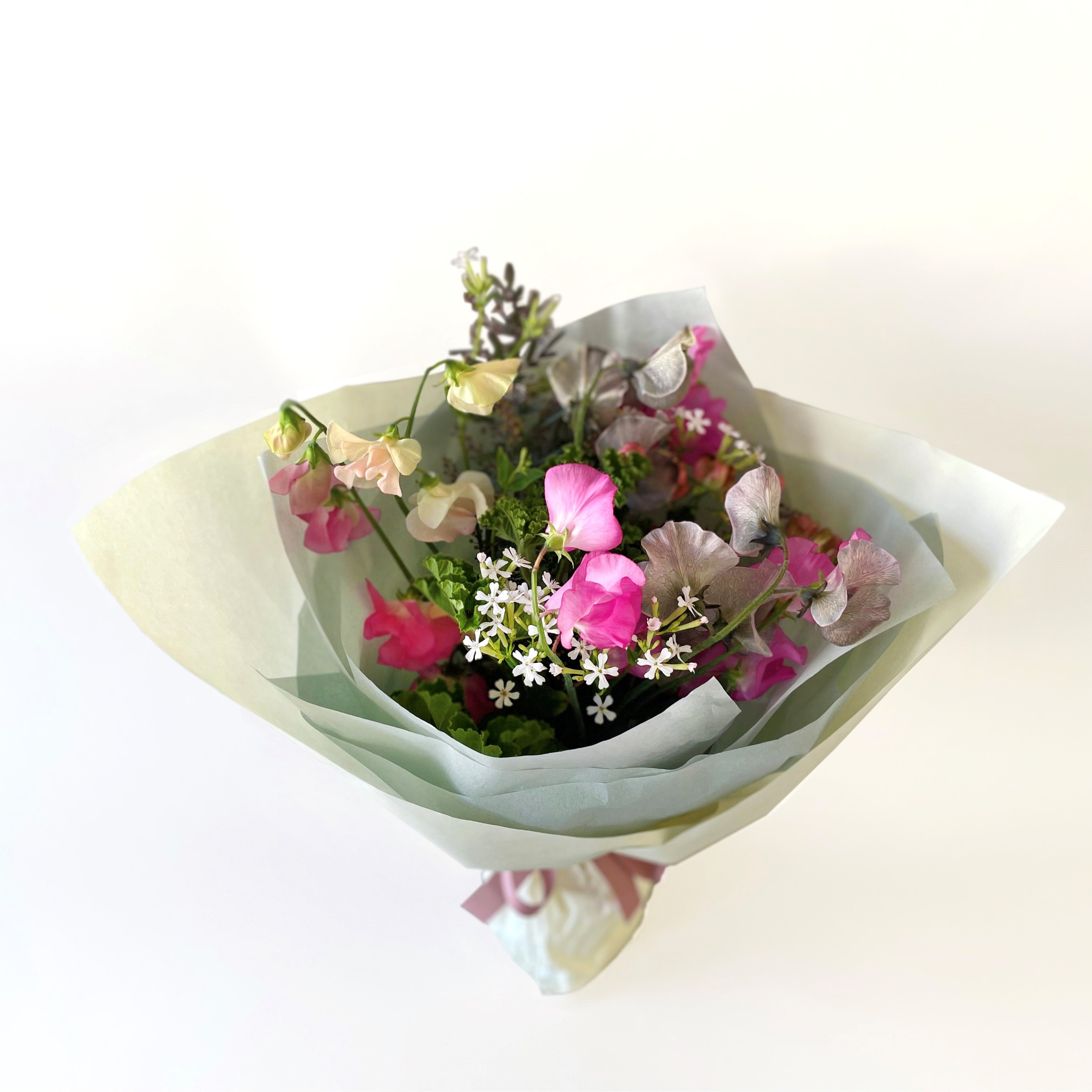 スイートピーをたっぷり束ねた、早春にぴったりのブーケ。季節の小花と合わせた香り豊かなブーケはリビングや食卓でもぴったりです。