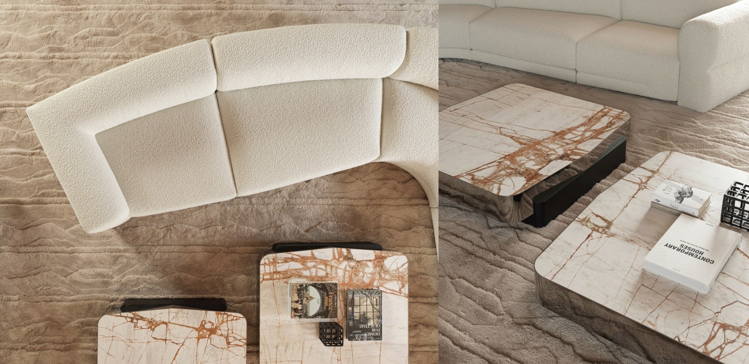 ODILE コーヒーテーブルはグラフィカルなラインが動きと多用途性をもたらし、リビングルームのアイコニックな存在として機能します。また、EMILEソファのユニットの間にぴったりと収まるように設計されており、機能性と美しさの両面で空間に統一感をもたらします。