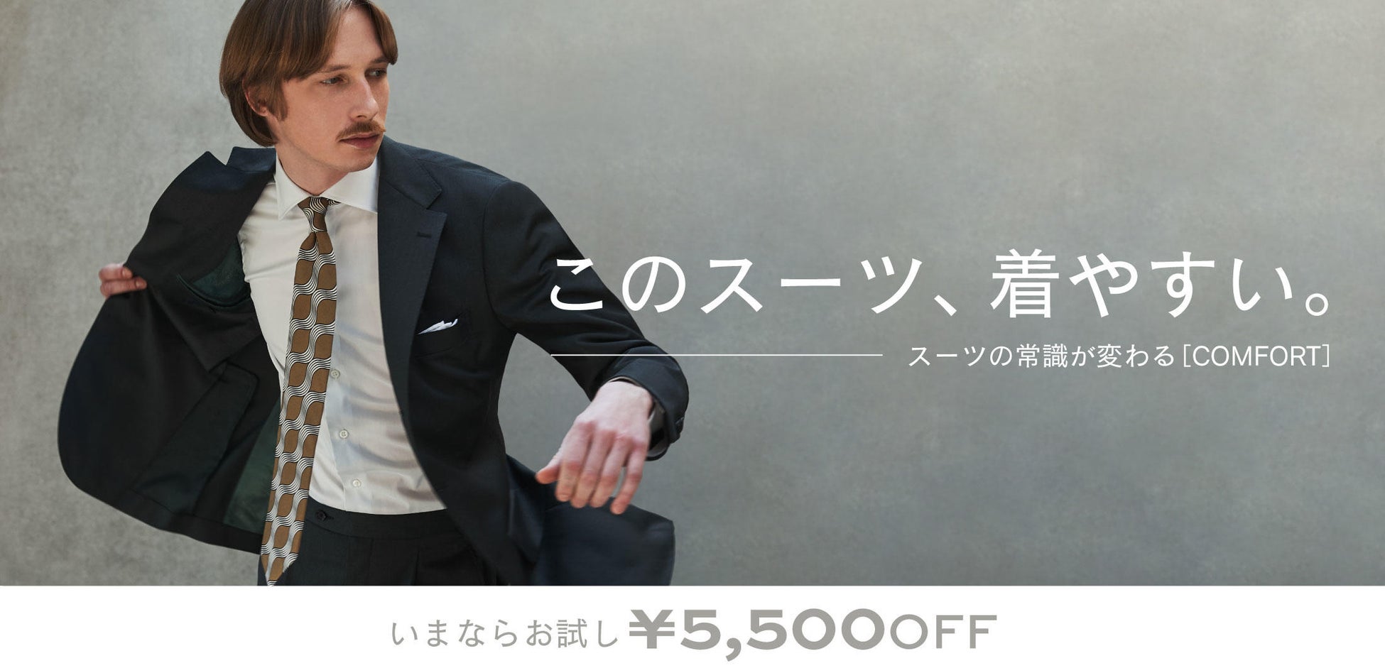 内容:公式ホームページの「COMFORT」限定クーポン画面をスクリーンショットし、スタッフにご提示いただくと、オーダースーツが ¥5,500 OFF
