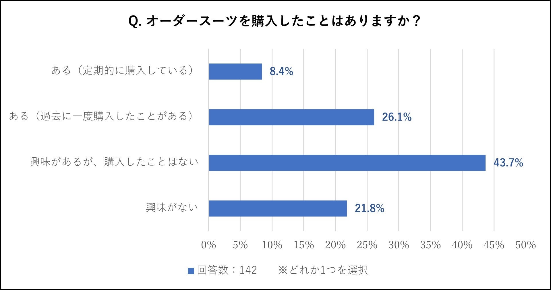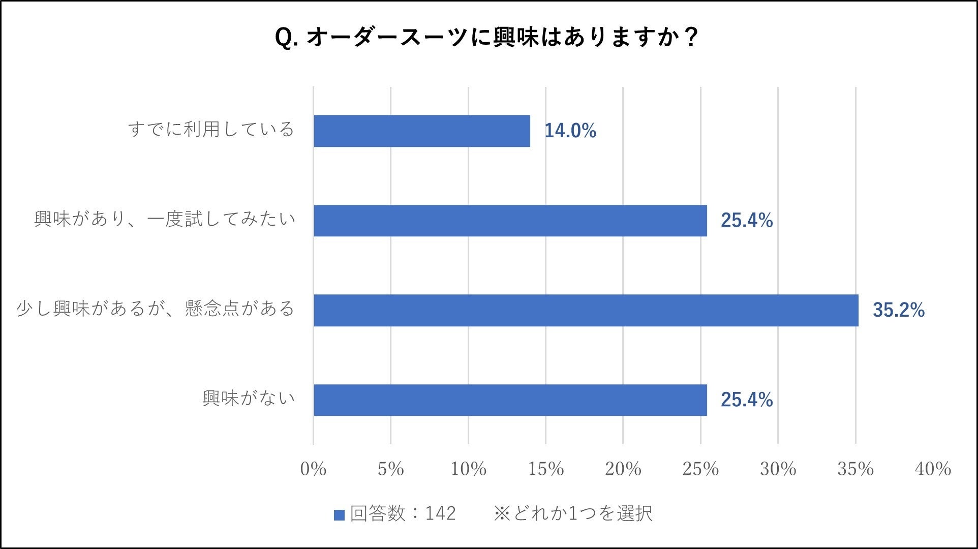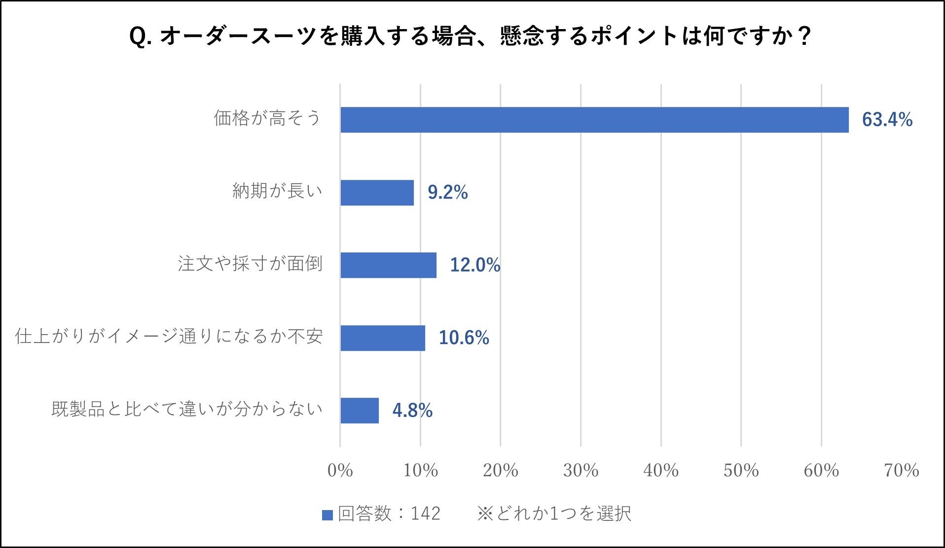 オーダースーツについては、「少し興味はあるが、懸念点がある」という回答が35.2%となり、「興味があり、一度試してみたい」という回答は25.4%と、多くの人がオーダースーツに関心を持っていることが分かりました。実際に、「過去に一度購入したことがある」人は26.1%にとどまり、「興味はあるが、購入したことはない」という人が43.7%と、購入に踏み切れていない方が多いことも明らかになりました。また、オーダースーツを購入する際の懸念として「価格が高そう」と回答する人が63.4%と半数以上を占め、価格の高さが最大のハードルとなっていることが分かりました。