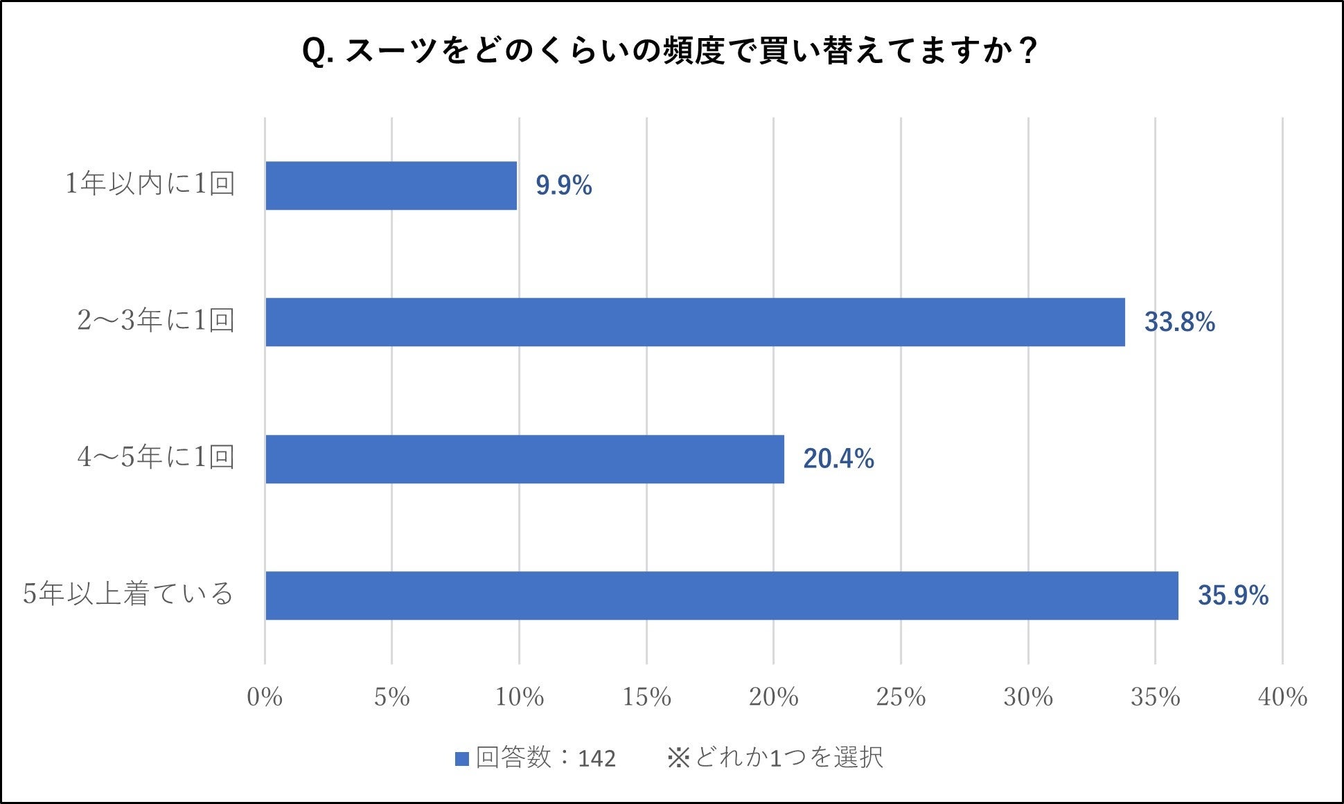 調査結果によると、「5年以上同じスーツを着続けている」と回答した人が35.9%と最も多く、次いで「2~3年に一度買い替える」が33.8%となり、多くの人が長年同じスーツを着用していることが分かりました。
