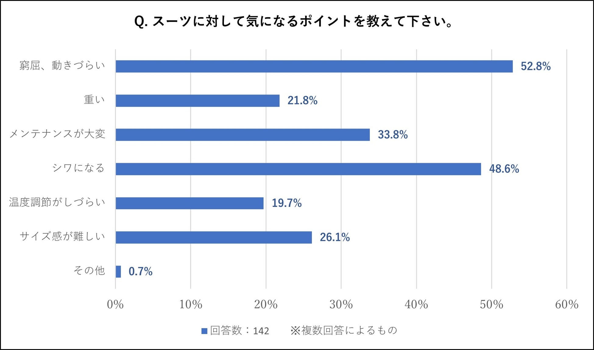 スーツに対する悩みとして、「窮屈で動きづらい」が52.8%と最も多く、次いで「シワになる」という回答が48.6%、「メンテナンスが大変」という回答が33.8%という結果となりました。特に、動きにくさを感じている人が半数以上にのぼり、ビジネスシーンにおいては快適なスーツのニーズが高まっていることが分かります。