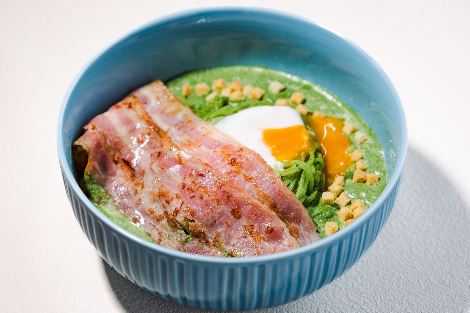 濃厚なほうれん草のポタージュに、とろ〜り温泉たまごでスタミナチャージ!! 香ばしいベーコンの旨みがアクセントの、夏限定ひんやり冷製麺。
