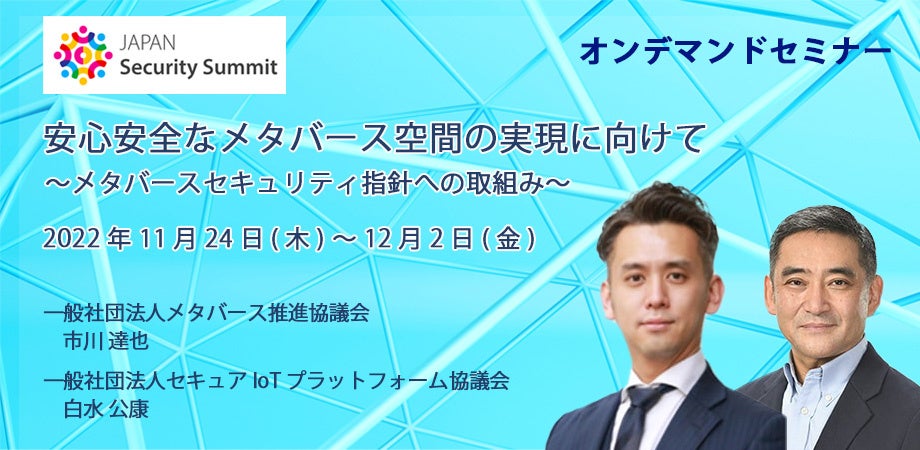 JAPANSecuritySummit Updateでは、一般社団法人メタバース推進協議会(代表理事:養老孟司)および一般社団法人セキュアIoTプラットフォーム協議会(理事長:辻井重男)の協力のもと、メタバース空間における安心安全なサービス提供および利活用のための指針を解説するセミナーを開催いたします。