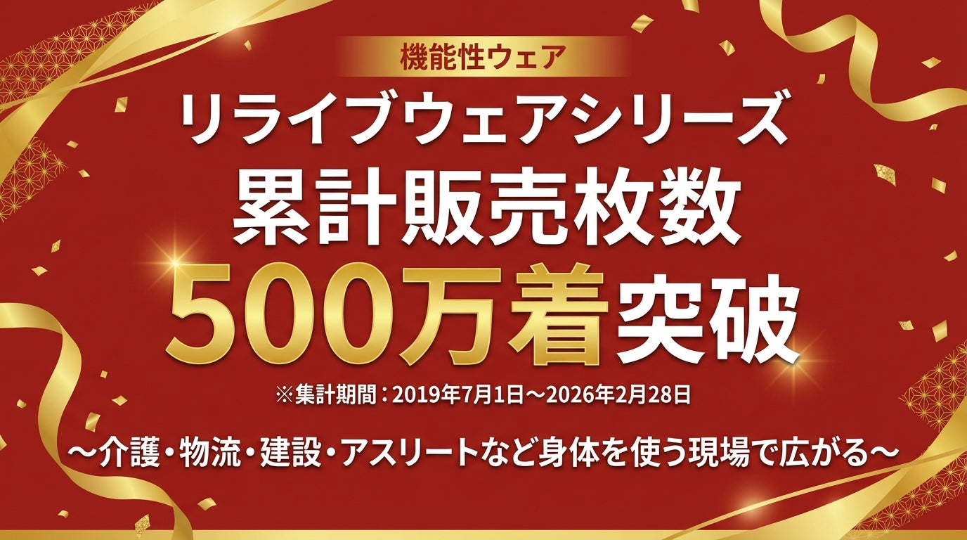 株式会社りらいぶ(本社:宮城県仙台市、代表取締役:佐々木貴史)が製造・販売する機能性ウェア「リライブウェア」が累計販売枚数500万着※1を突破。介護や製造、物流などの現場を中心に利用が広がっています。