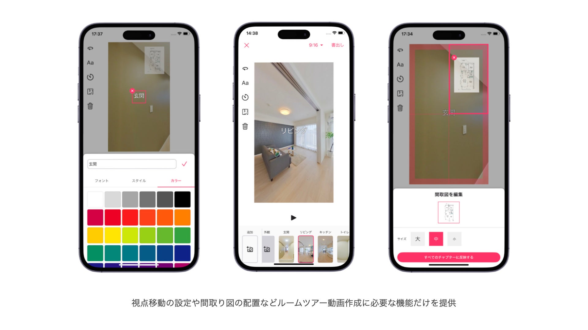 部屋内を紹介するためのツアー動画作成機能に特化することで、初めて操作するユーザーでも迷わずに使えるようなUIを提供しています。