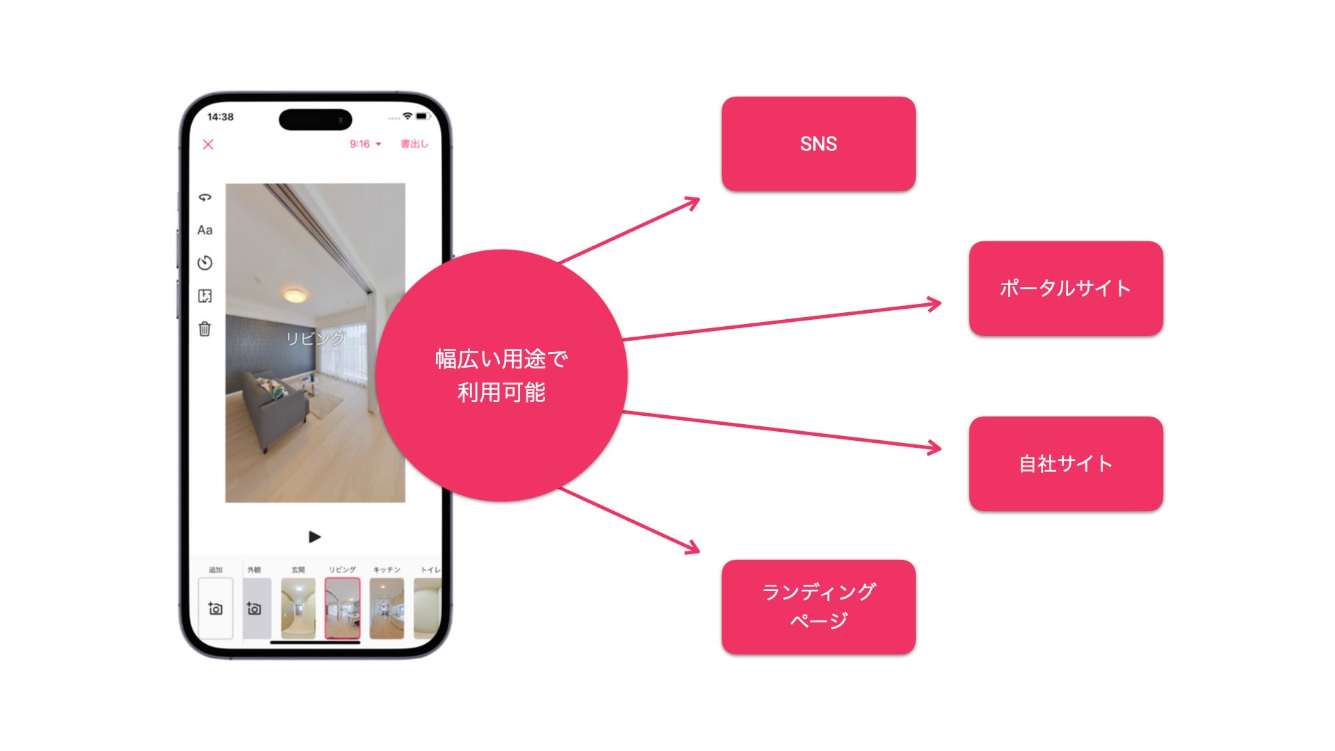 作成した動画は InstagramなどのSNSはもちろん、ポータルサイトや自社サイトへの掲載も可能です。