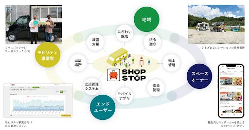 キッチンカーをはじめとした店舗型モビリティビジネス向けのプラットフォームです。プラットフォームのステークホルダーに対して複合的な課題解決および価値を提供しています。現在、営業場所798カ所、登録店舗数2125店と日本最大規模となっており、全国20都道府県で営業を実施済み(実証実験含む)で、今後もエリア拡大を加速していきます。