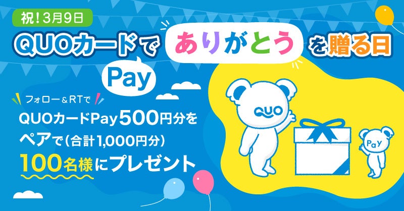 全国共通のプリペイドカード「QUOカード」とスマートフォンで使えるデジタルギフト「QUOカードPay(クオ・カード ペイ)」を発行する株式会社クオカード(以下当社、本社:東京都中央区、代表取役社長:近田 剛)は、一般社団法人日本記念日協会より認定を受け、毎年3月9日を 「QUOカードで『ありがとう』を贈る日」に制定しました。この記念日制定を記念して、3月1日(火)より「QUOカード」「QUOカードPay」で大切なあの人に「ありがとう」を贈れるTwitterキャンペーンを実施します。
