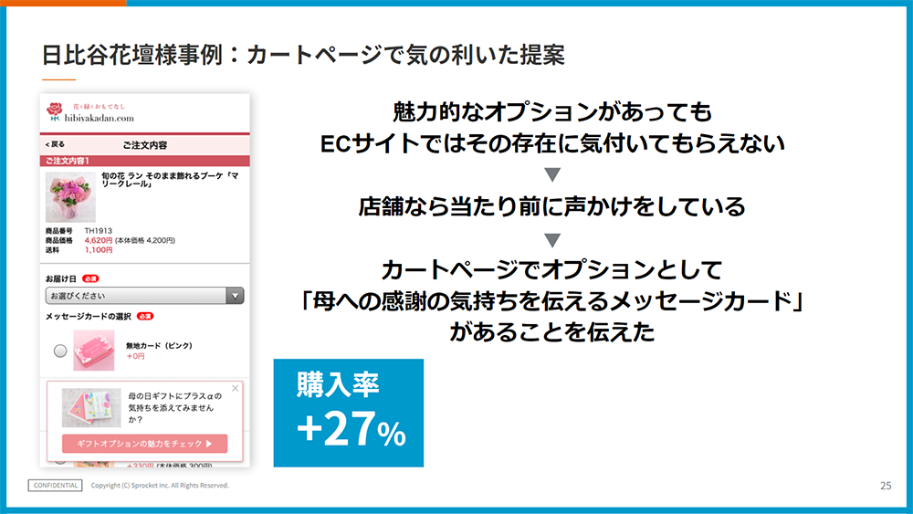 株式会社日比谷花壇では「店舗で店員が行っている気の利いた提案を、ECでも行いたい」という課題がありました。店舗では、店員がお客様の様子を見て、心理を読み解いた上で声かけや接客をしています。同社はSprocketを利用して、店員の接客を再現するような施策を実施しました。