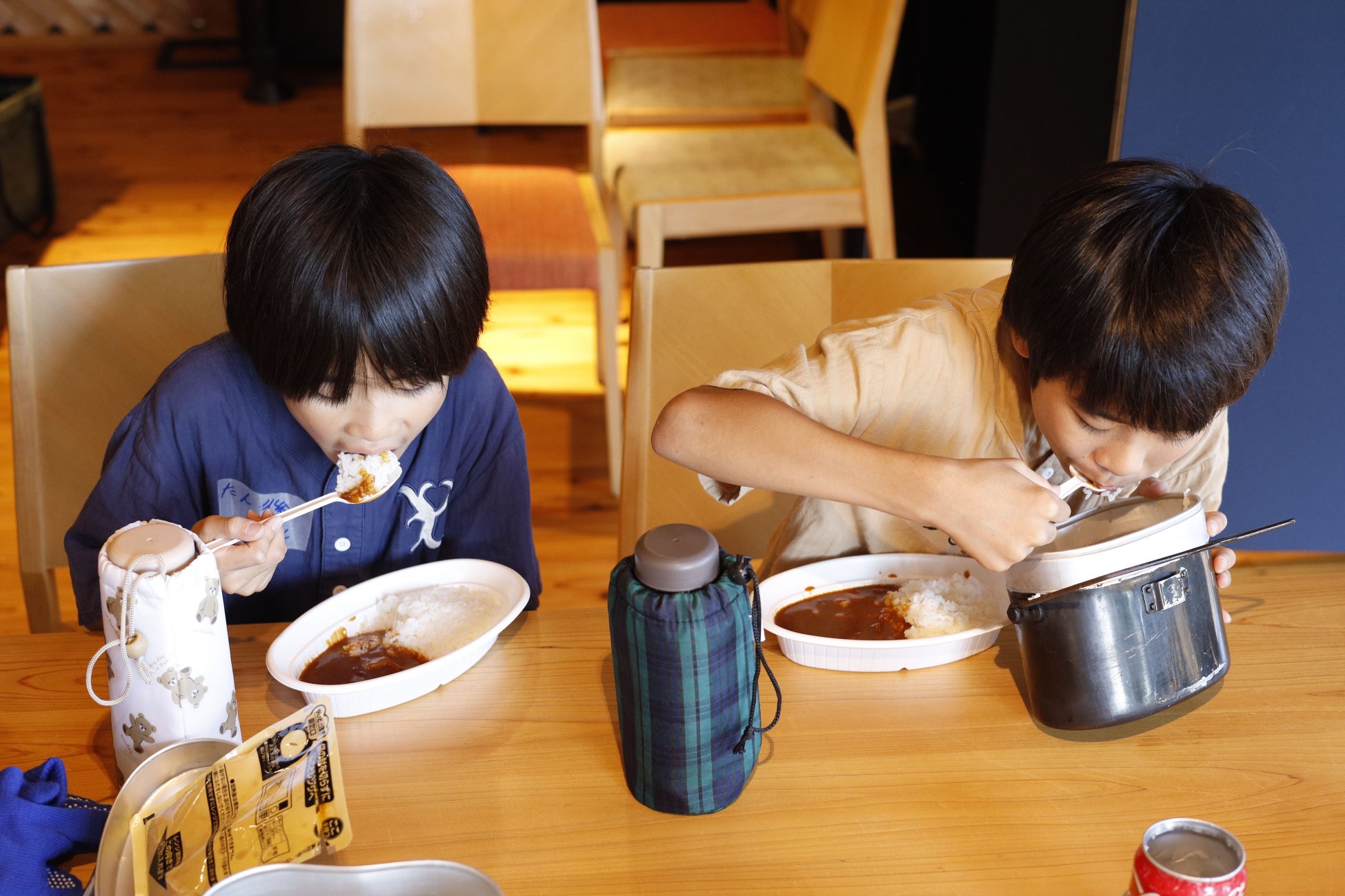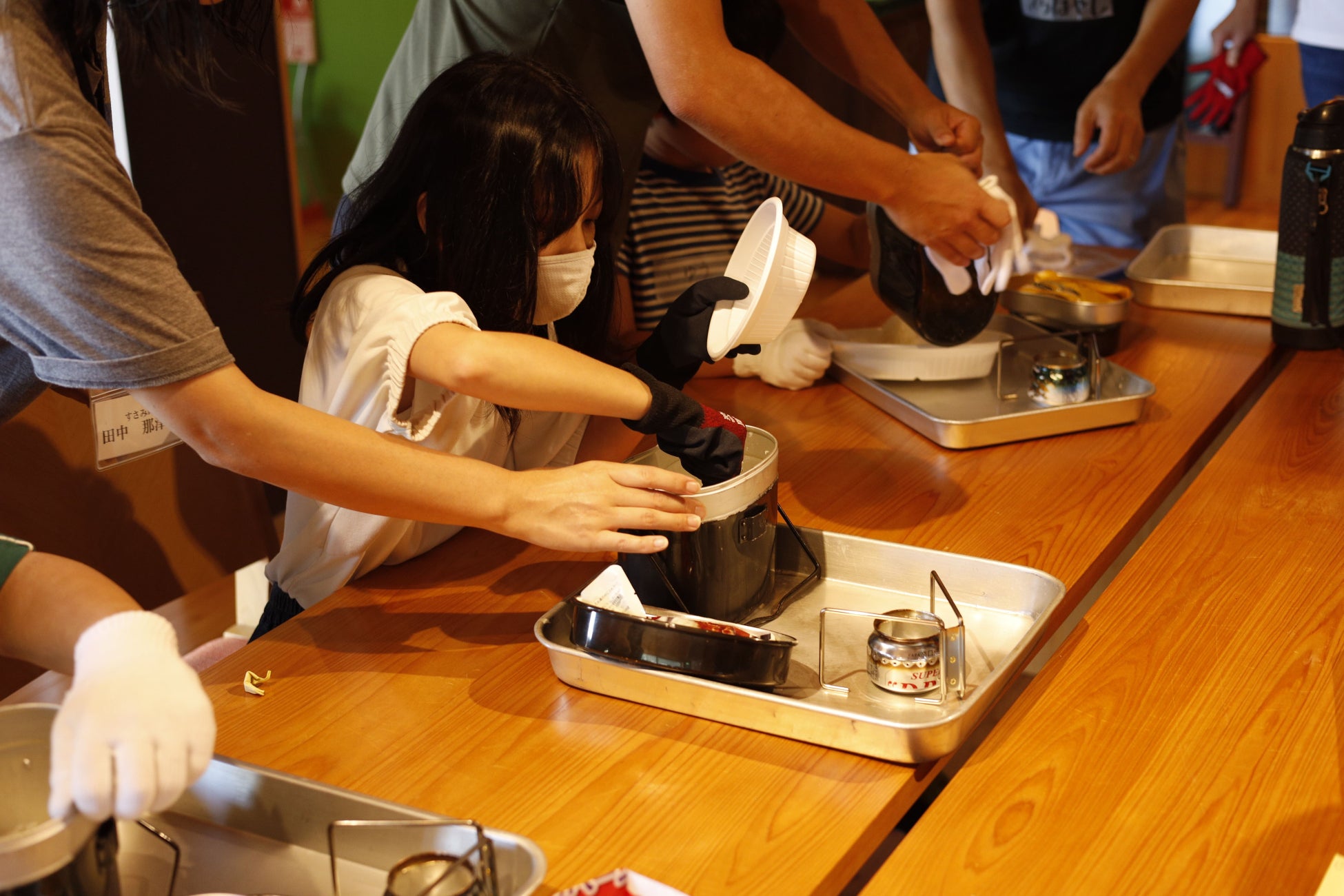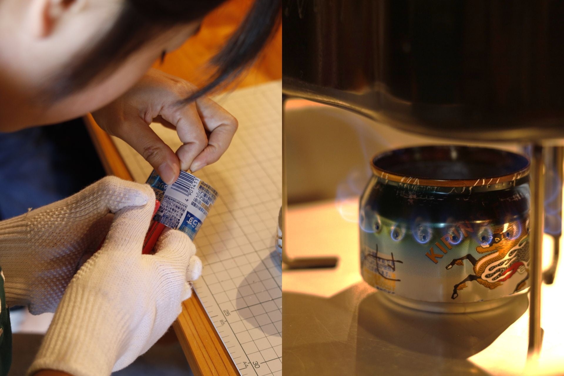 ワークショップに参加したのは、和歌山県西牟婁地方に在住の小学生9名。各々は自宅にあった廃棄アルミ缶を持参し、ガスコンロ作りに奮闘。完成後は、実際に自分たちで作ったガスコンロを使って飯盒でご飯を炊き、カレーを温めて食べました。