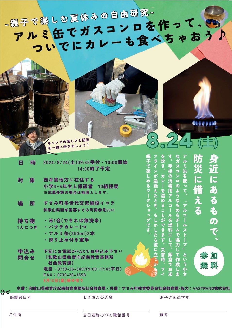 キャンプギアブランド「VASTLAND(ヴァストランド)」を展開するVASTLAND株式会社(本社:兵庫県姫路市/代表:田中悠貴)は、和歌山県教育庁紀南教育事務所社会教育課が主催する絆づくり事業に協力し、身近なもので防災に備える体験型ワークショップ「アルミ缶でガスコンロを作って、ついでにカレーも食べちゃおう。」を8月24日(土)に開催しました。