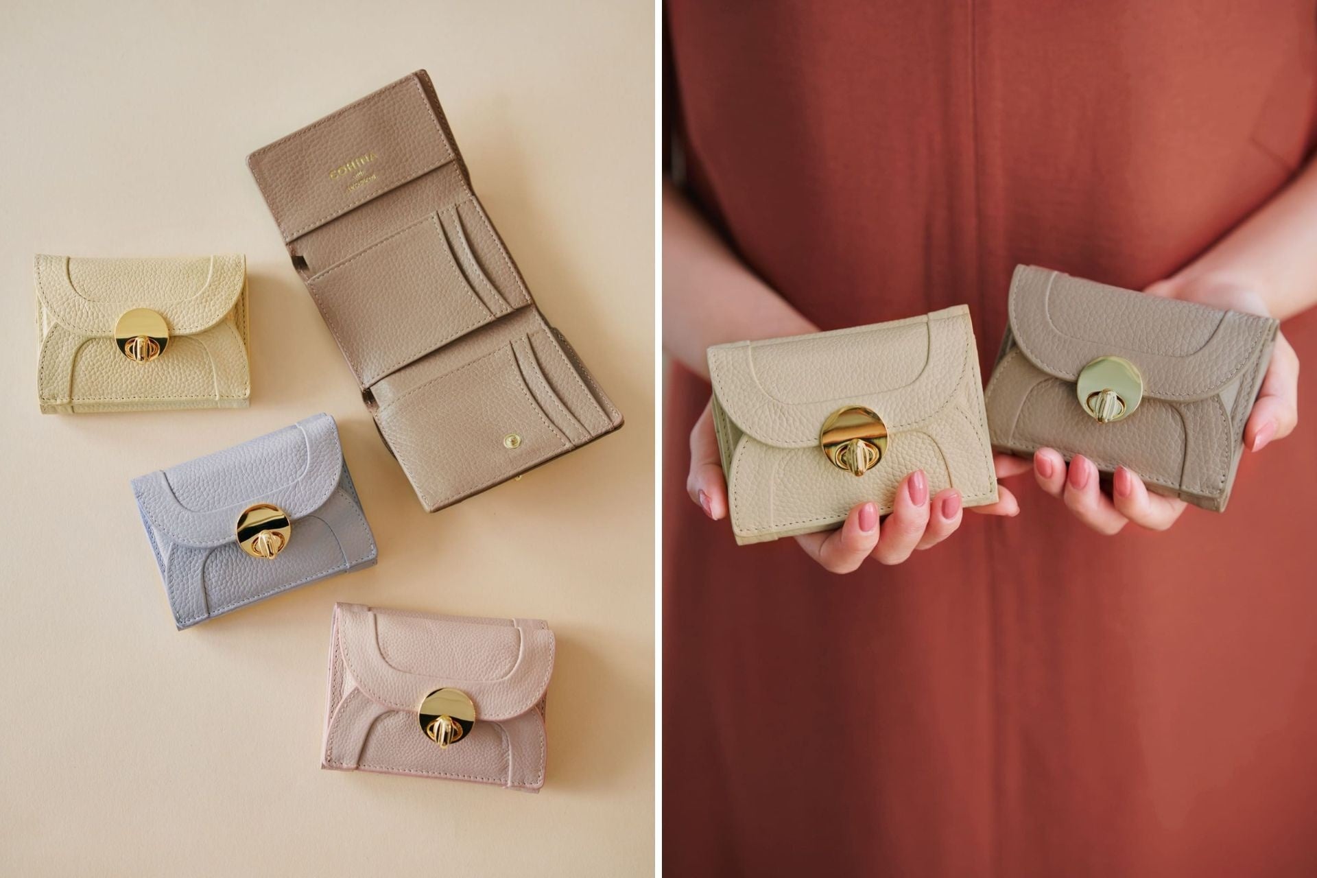 そんな特別な日に登場するミニウォレットは、コンパクトながらカード入れ7つ、内ポケット3つ、外ポケット1つの計11箇所に収納ポケットがあり、機能性も抜群です。上品なカラーリングに丸いゴールドの金具がアクセントとなり、女性らしさと高級感をプラス。カード入れの取り出し口の形状や、内側にある「COHINA with HASHIBAMI」の箔ロゴは、今回のコラボレーションだけのオリジナルデザインです。全色別注カラーとなっており、アイボリー、グレージュ、ピンクベージュ、ブルーの4色をご用意しました。
