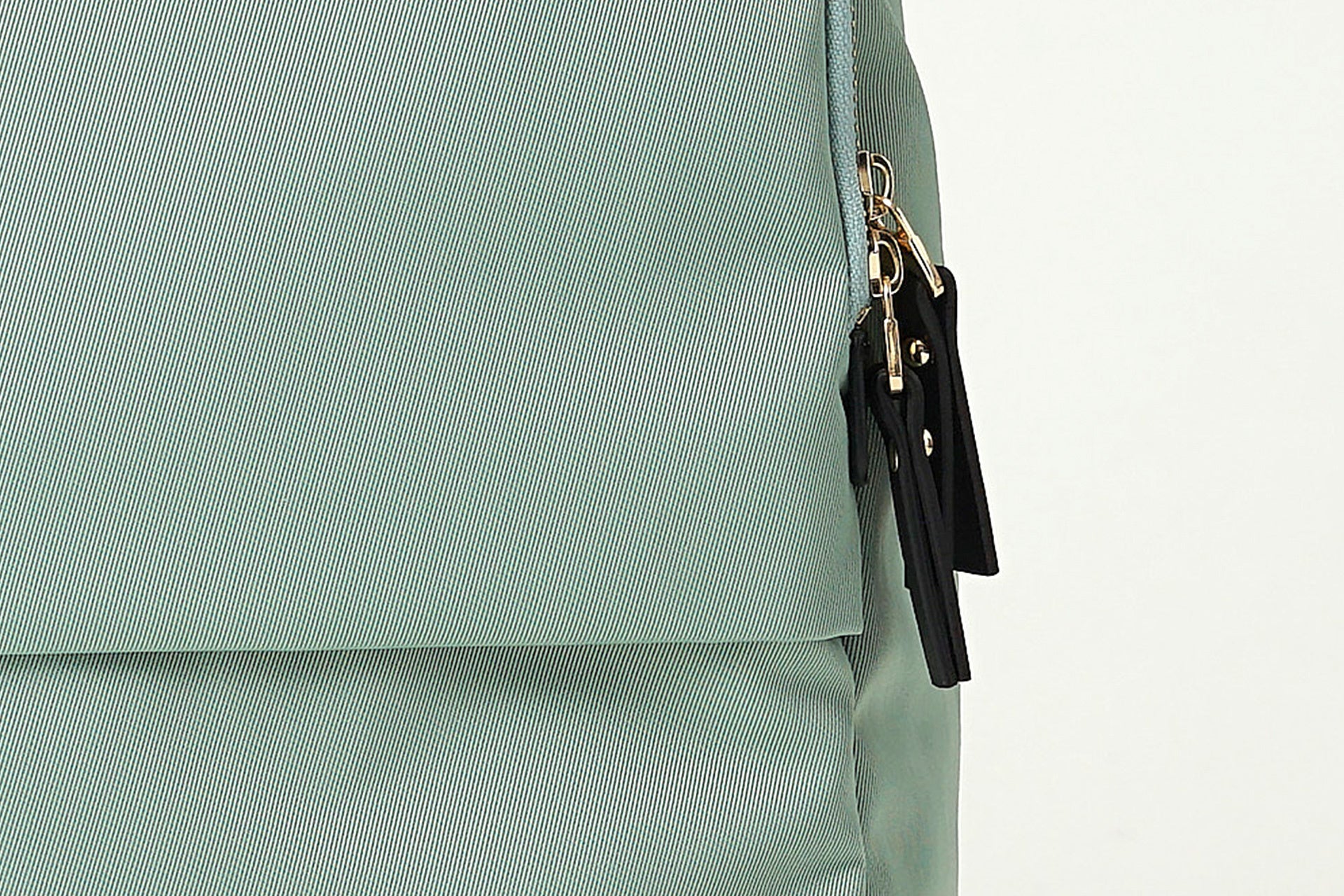 フロントにあしらわれたのは、北欧のアイコンであるエルク(ヘラジカ)をデザインしたゴールドのロゴプレート。プリントや刺繍ではなく、立体感のあるメタルパーツを採用することで、アクセサリーのような輝きをプラスしました。ペールミントの柔らかな色調に、ゴールドの華やかさが加わることで、高級感を醸し出します。