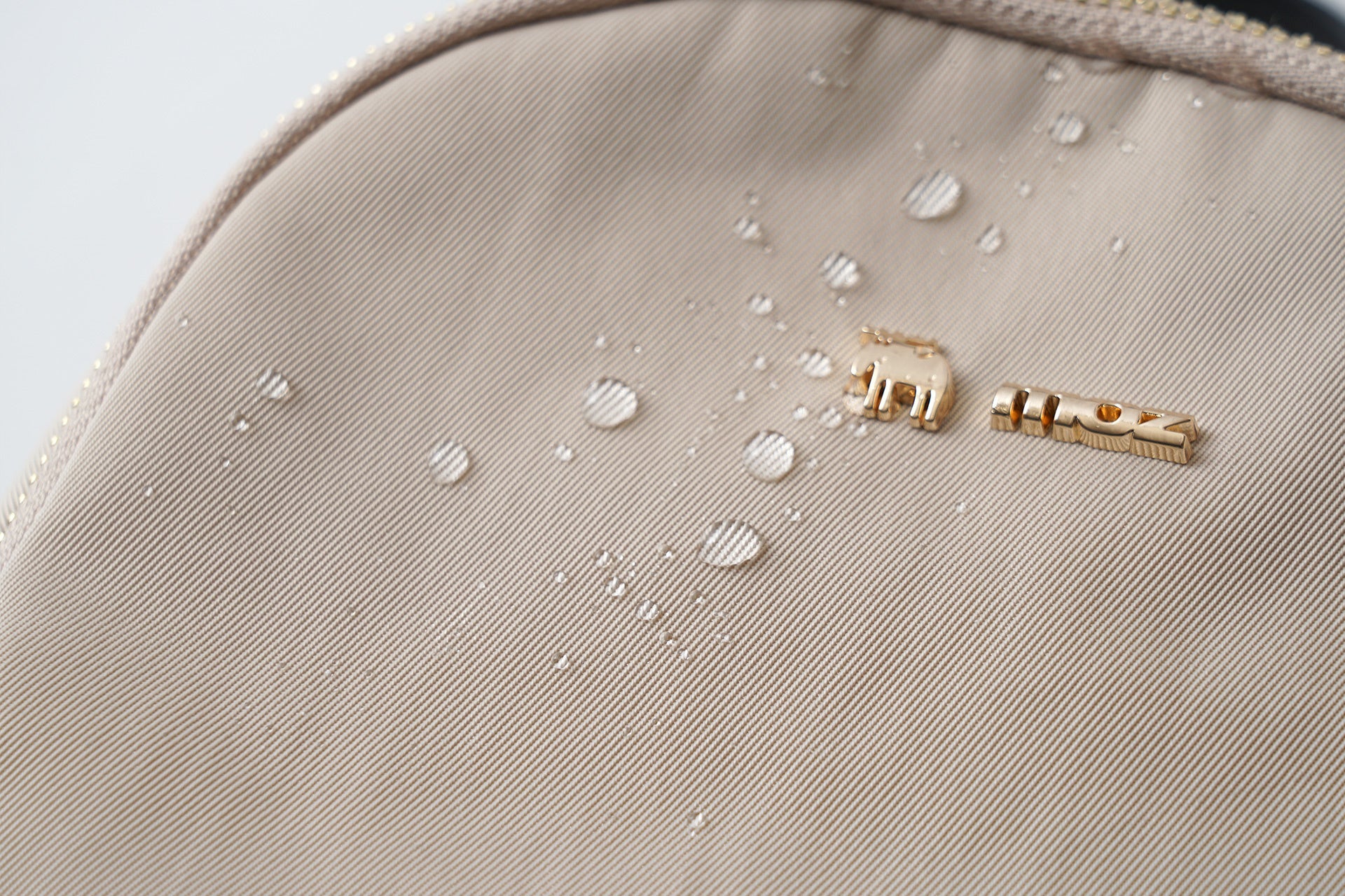 しっかりとした高密度なナイロン生地は肌触りが良く、軽撥水加工が施してあるので雨や汚れが染み込みにくい。