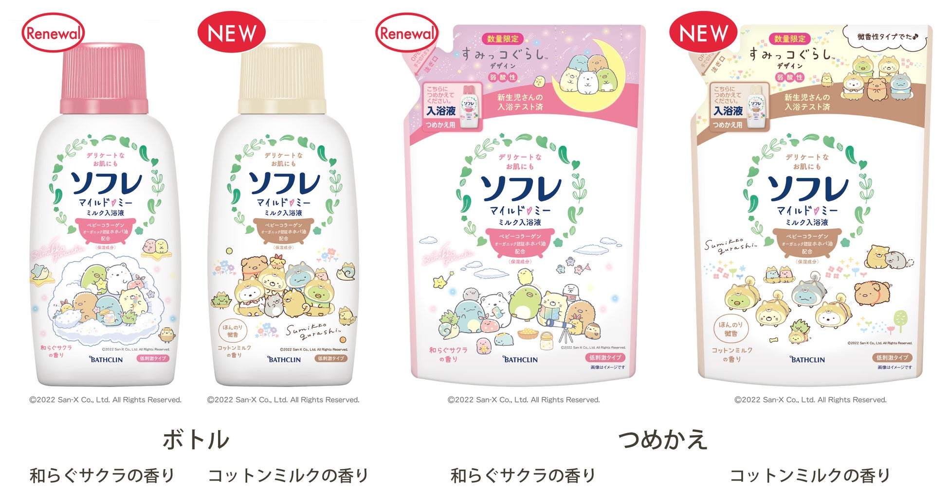 液体入浴液No.1*1ブランド「ソフレ」から、デリケートなお肌を考えた、低刺激タイプの入浴液「ソフレ マイルド・ミー ミルク入浴液 コットンミルクの香り」を新発売するとともに、「和らぐサクラの香り」を装い新たにリニューアルいたします。また、リニューアルに伴い、「和らぐサクラの香り すみっコぐらしデザイン」「コットンミルクの香り すみっコぐらしデザイン」を9月13日(火曜日)に数量限定で発売いたします。