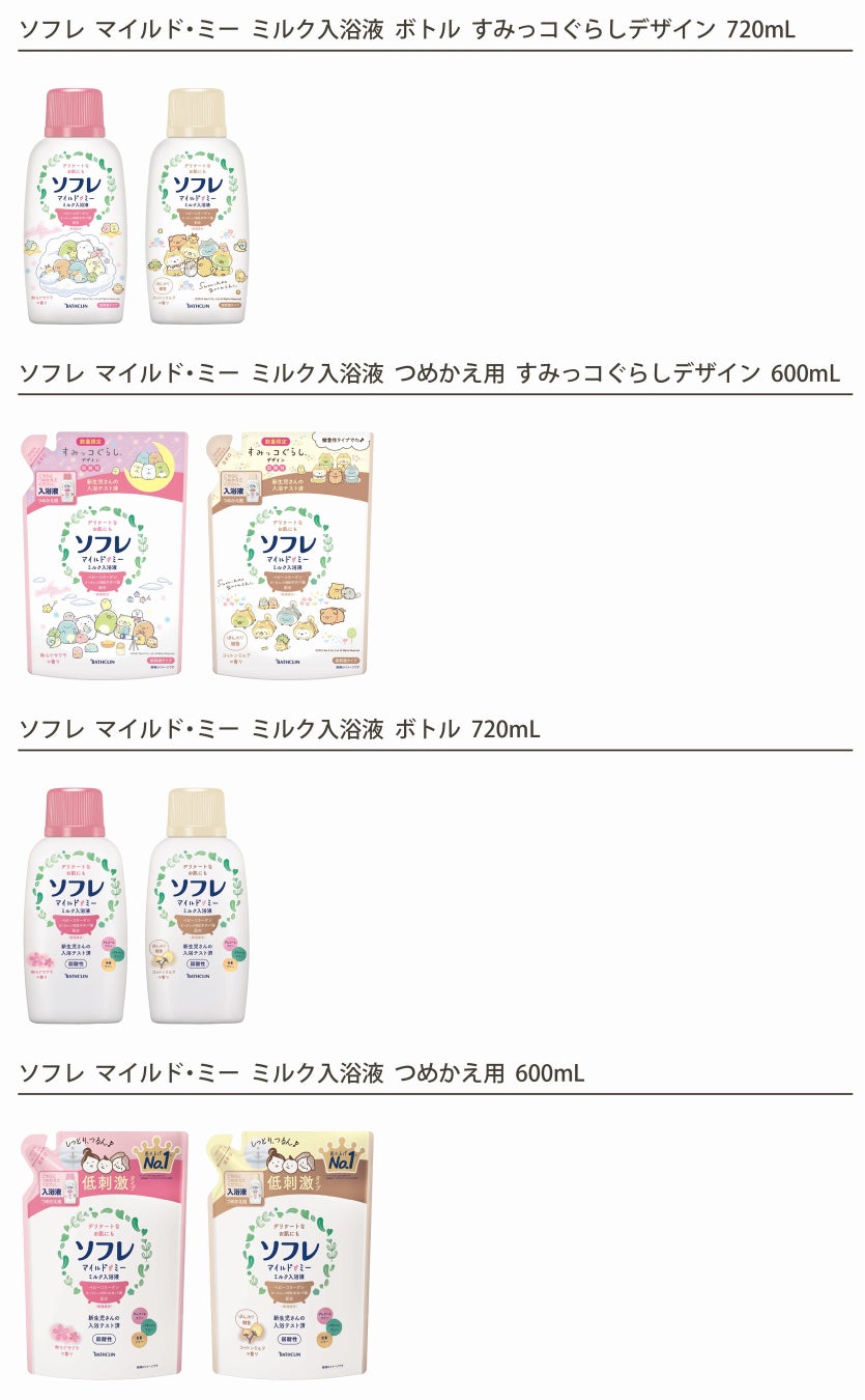 家族みんなの、デリケートなお肌をケア 「ソフレ マイルド・ミー ミルク入浴液」より「コットンミルクの香り」9月13日より新発売 「すみっコぐらし」デザイン同日より数量限定発売