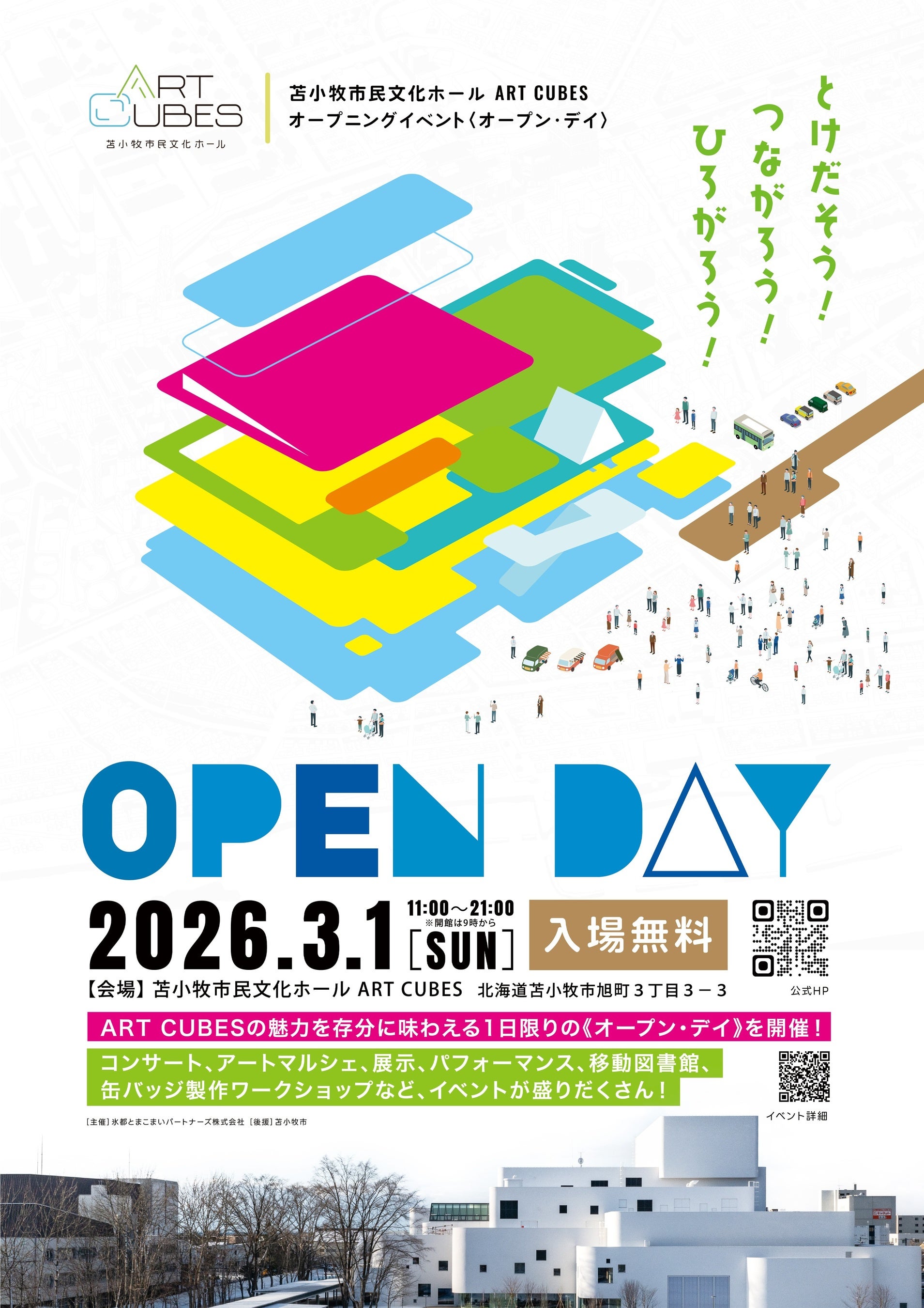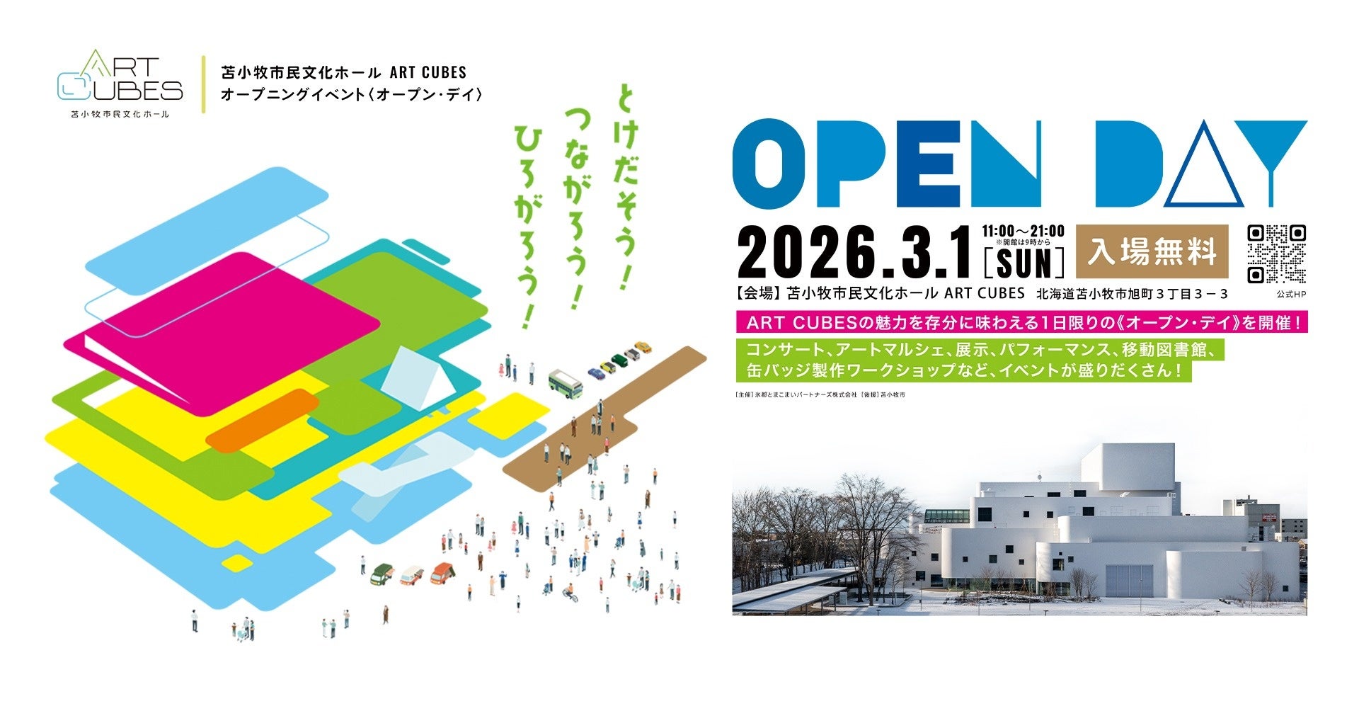 特別目的会社・氷都とまこまいパートナーズ(株式会社シアターワークショップ(本社:東京都渋谷区)が構成企業として参画)は、苫小牧市民文化ホール ART CUBES(所在地:北海道苫小牧市)の2026年3月1日(日)の開館を祝し、同日に一日限りのオープニングイベント、<オープン・デイ>を開催いたします。